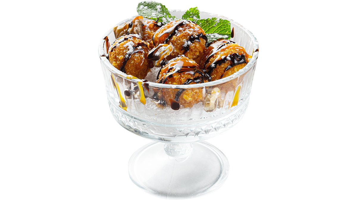 Sūrio pyrago rutuliukai su avietėmis, patiekiami su šokoladu, karamele ir graikiniais riešutais.