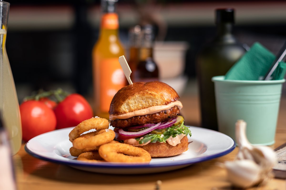 Veggie burger Brioche, jogurtinis žolelių padažas, traškūs svogūnų žiedai, čederis, pomidorai, salotos, marinuoti saldūs svogūnai ir agurkėliai + fritkės su rūkytų paprikų majonezu. Brioche, herbed yogurt sauce, crispy onion rings, cheddar, tomato, lettuce, pickled sweet onion & pickles + fries with smoked paprika mayo sauce.