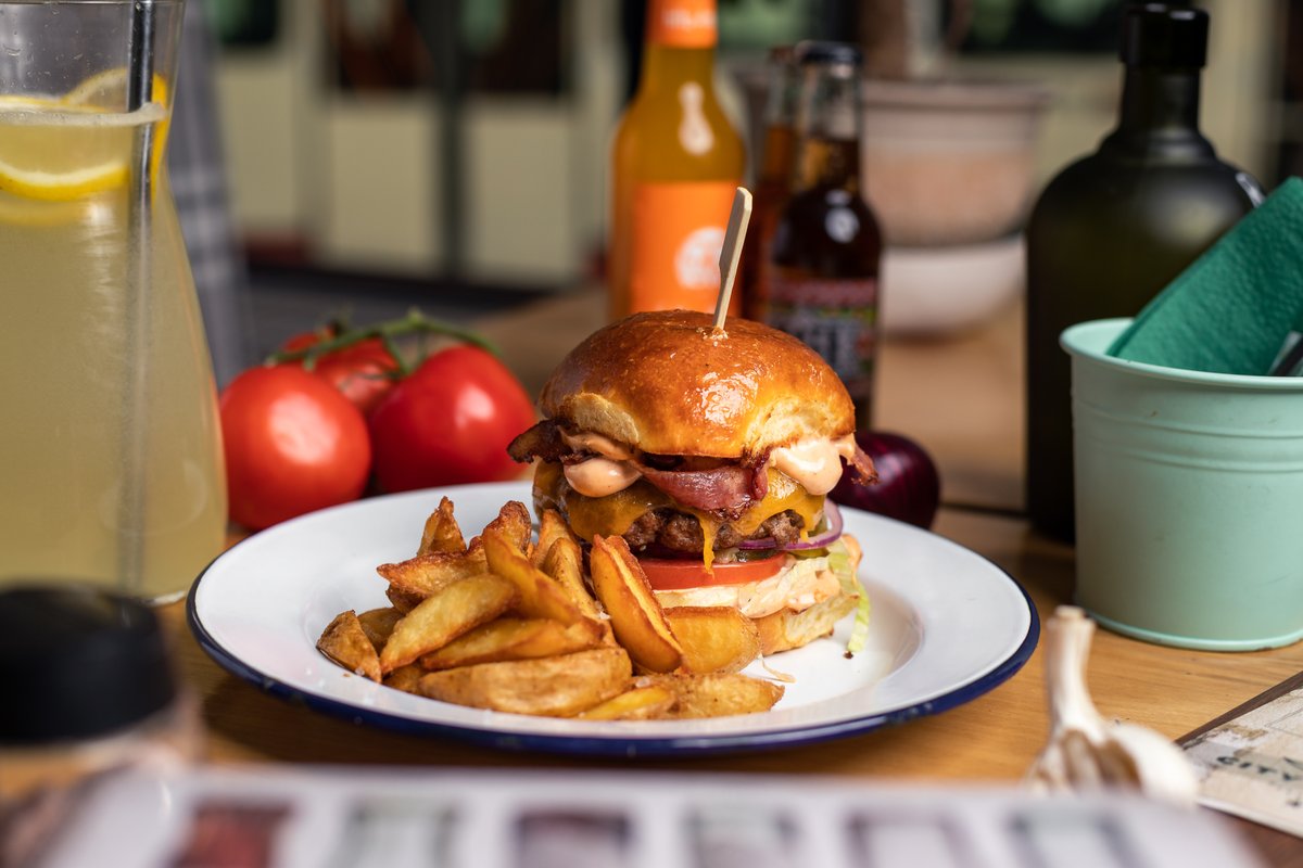 Local aged Beef Burger Brioche bandelė, rūkytų paprikų majonezas, šoninė, čederio sūris, pomidorai, salotos, marinuoti saldieji svogūnai ir agurkėliai + fritkės su rūkytų paprikų majonezu. Kepame medium well, kad paplotėlio sultys nesušlapintų apatinės bandelės. Brioche, smoked paprika mayo, bacon, cheddar cheese, tomatoes, lettuce, pickled sweet onion & cucumber + fries with smoked paprika mayo sauce. Meat will be cooked medium well, so that the juice from the meat will not soak the bun.