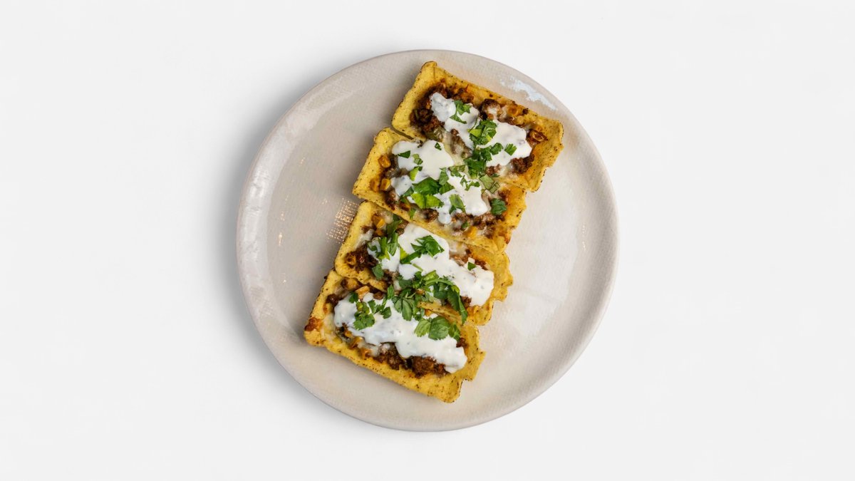 Enchiladas su malta mėsa, pomidorų-kalendrų padažu, čederiu ir parmezanu