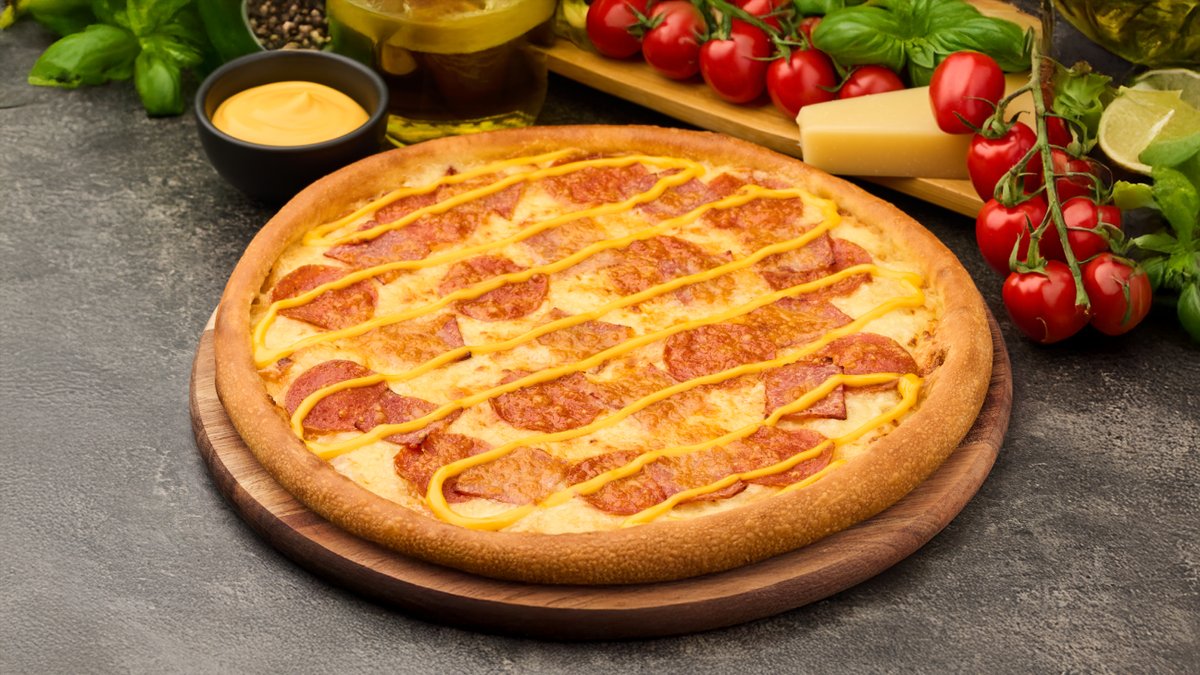 Grietinėlės padažais, mocarelos sūris, pepperoni, kumpis, čederio sūris