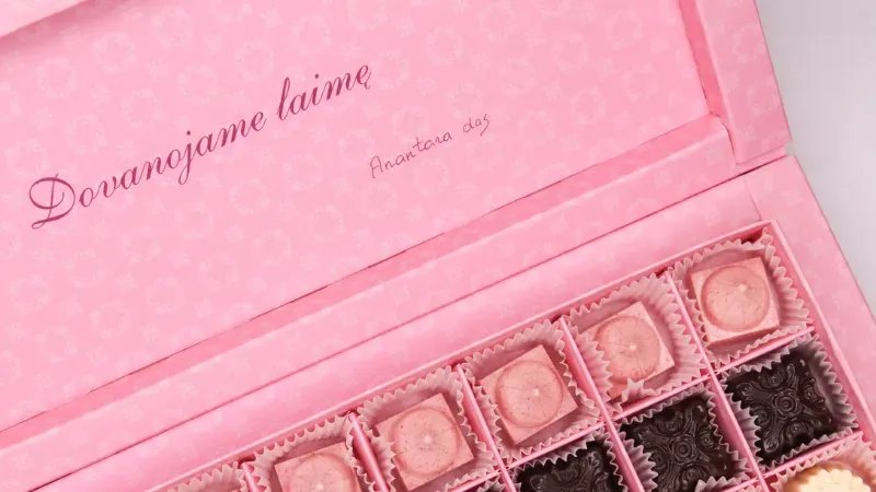 Rankų darbo saldainiai prema – elegantiško dizaino dėžutėje rasite trijų skonių šokoladinius saldainius: kerobinius, baltojo šokolado su avietėmis ir baltojo šokolado su lazdynų riešutais
