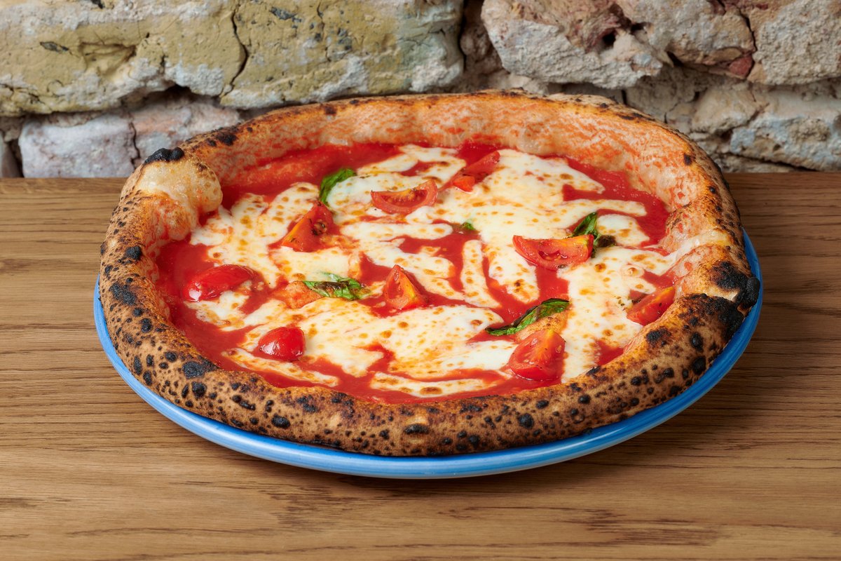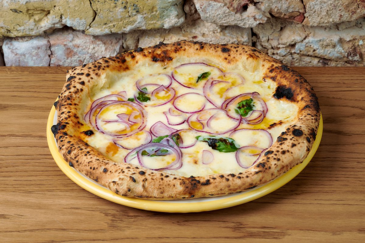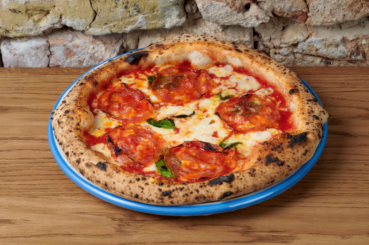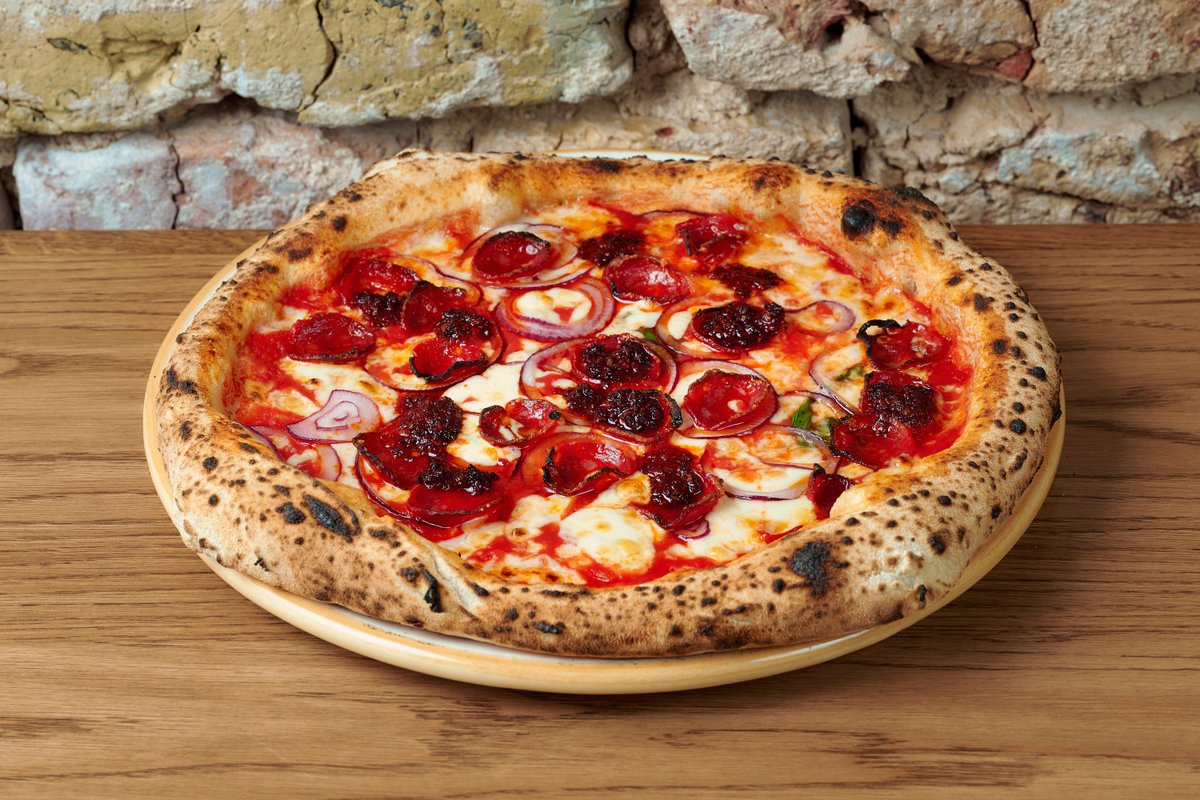 Natūrali pomidorų tyrė, mozzarella, nduja, pepperoni piccante, svogūnas, bazilikas