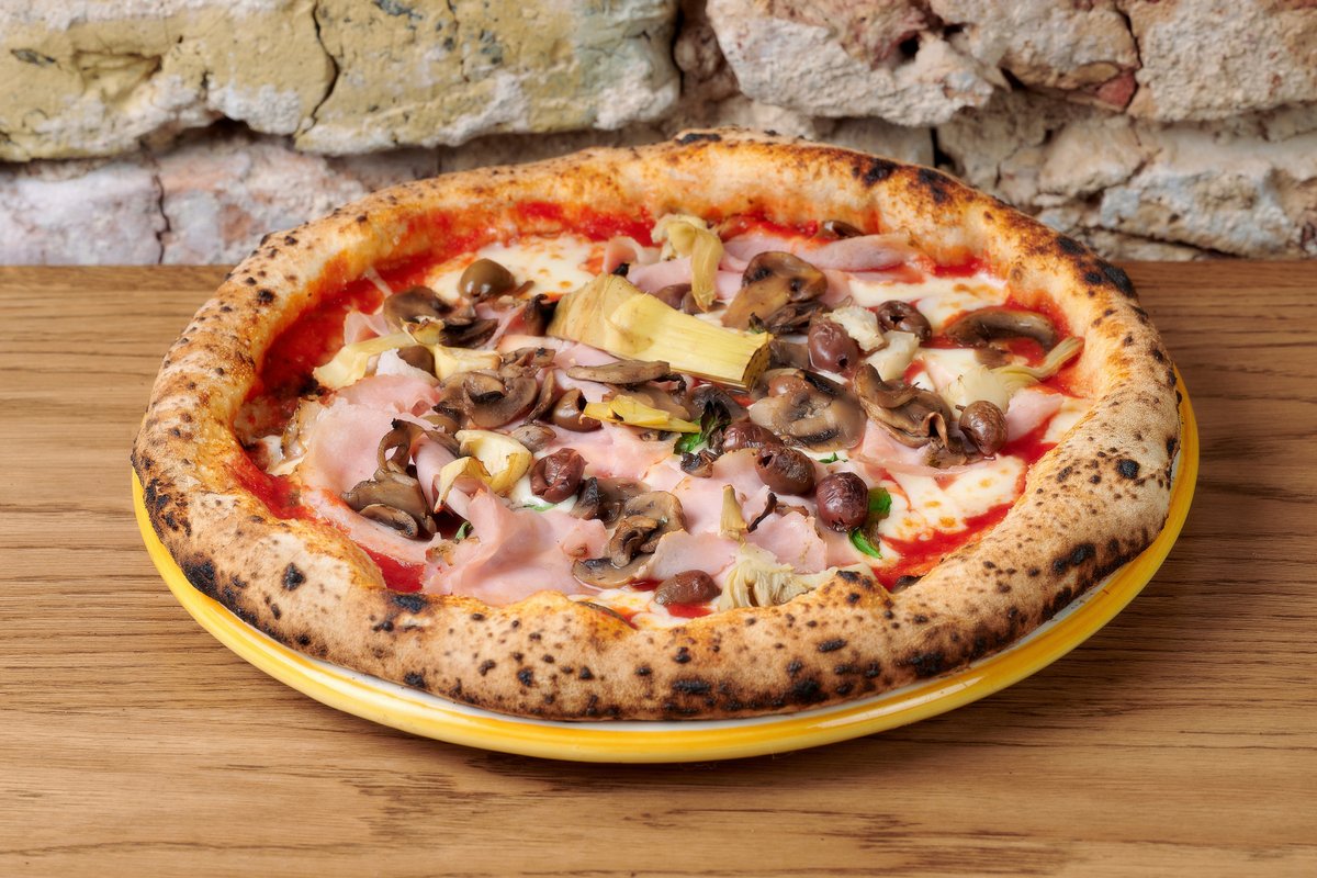 Natūrali pomidorų tyrė, mozzarella, prosciutto arrosto, pievagrybiai, artišokai, alyvuogės, bazilikas, tyras alyvuogių aliejus