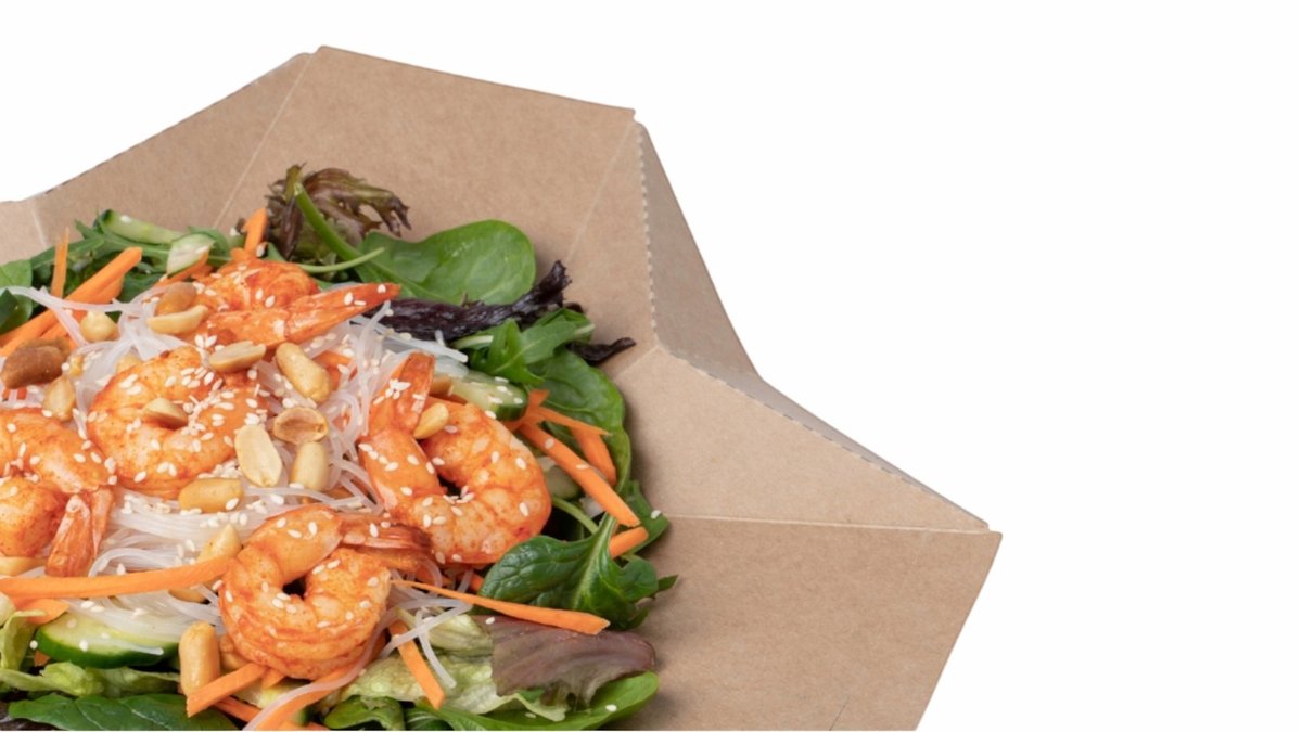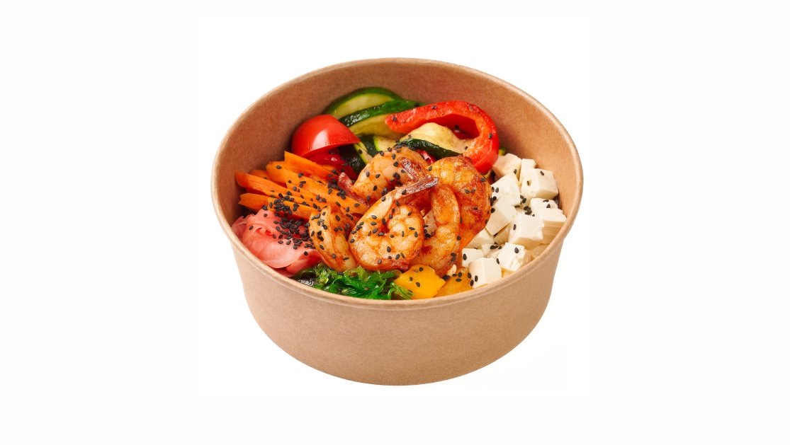 Bolivinė balanda, keptos krevetės, mangai, jūros dumblių salotos ,,wakame", marinuotas imbieras, cukinija, raudonoji paprika, morkos, feta sūris, sezamo sėklos, alyvuogių aliejus, prieskoniai.