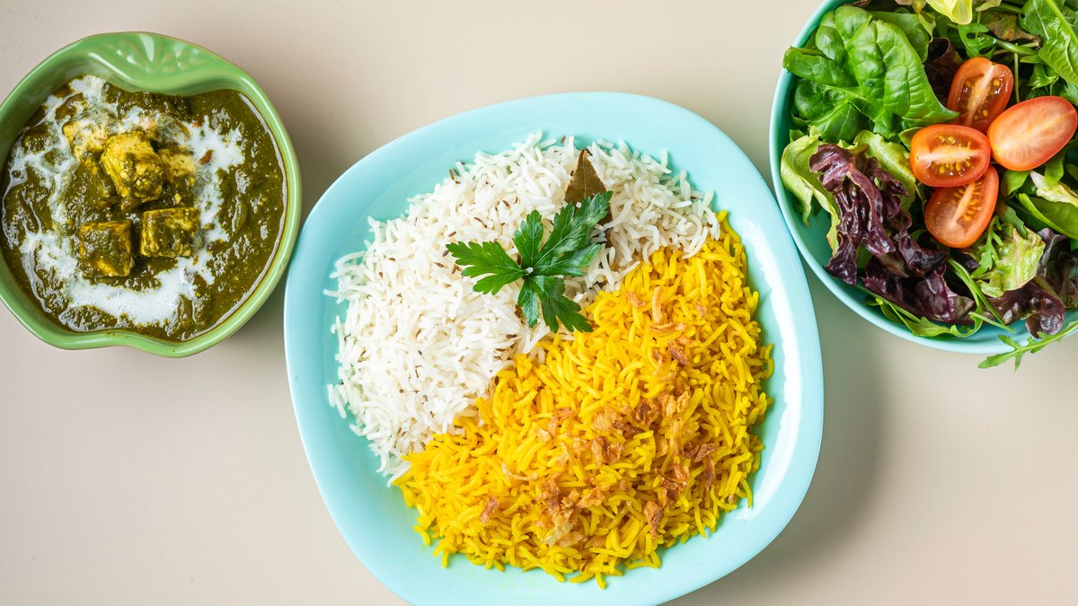 Indian basmati rice pilaf biryani with tomato sauce and Greek yogurt