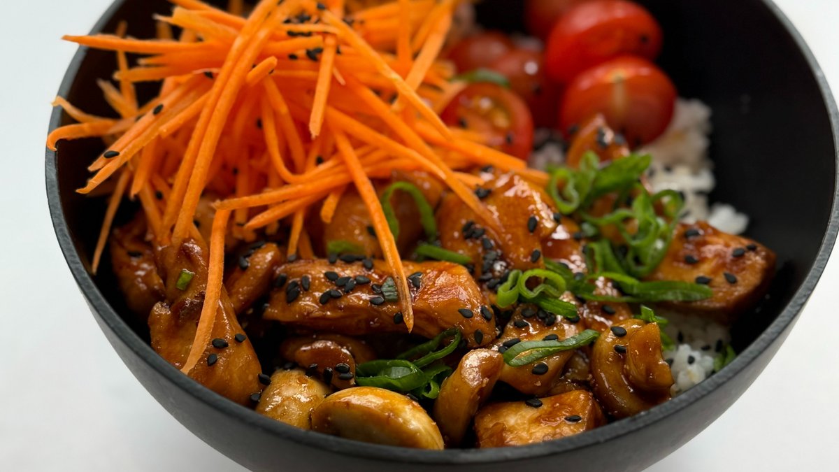 Teriyaki vištiena su grybais ir morkomis ryžių dubenėlis