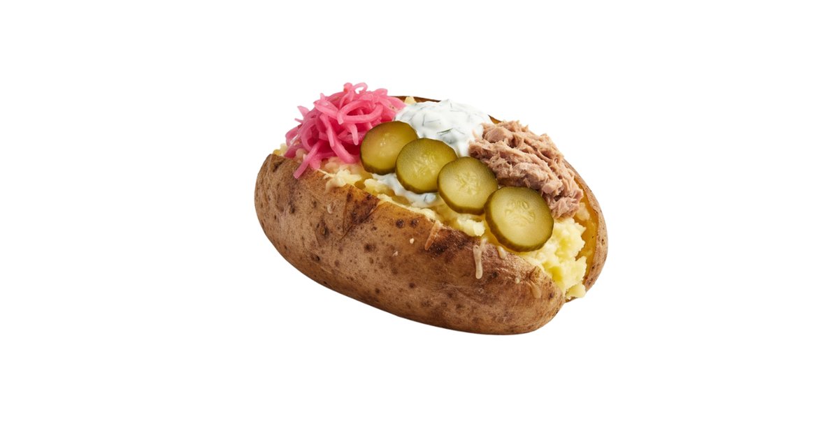 Bulvė, sviestas, sūris, tunas, marinuoti svogūnai, rauginti agurkai, jogurto padažas, alyvuogės, kukurūzai