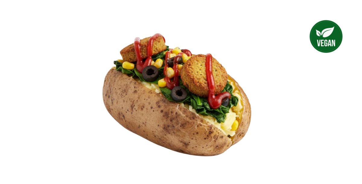 Bulvė, alyvuogių aliejus, falafeliai, špinatai, kukurūzai, kečupas