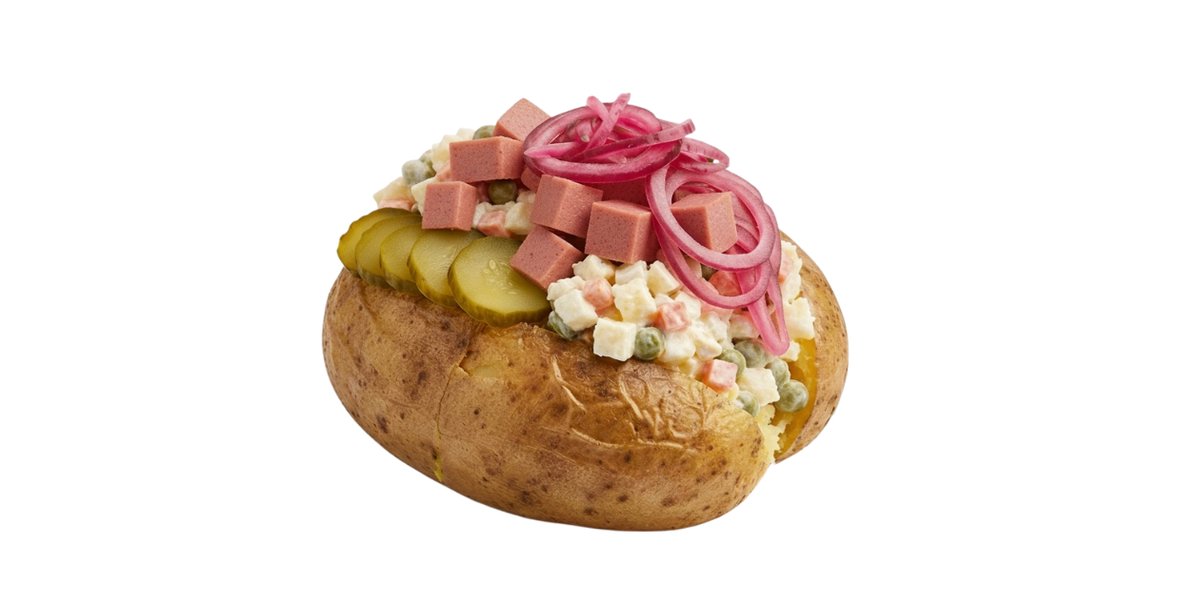 Bulvė, sviestas, sūris, salotos „Olivjė“, rūkyta filė, marinuoti raudonieji svogūnai, jogurto padažas, marinuoti agurkai