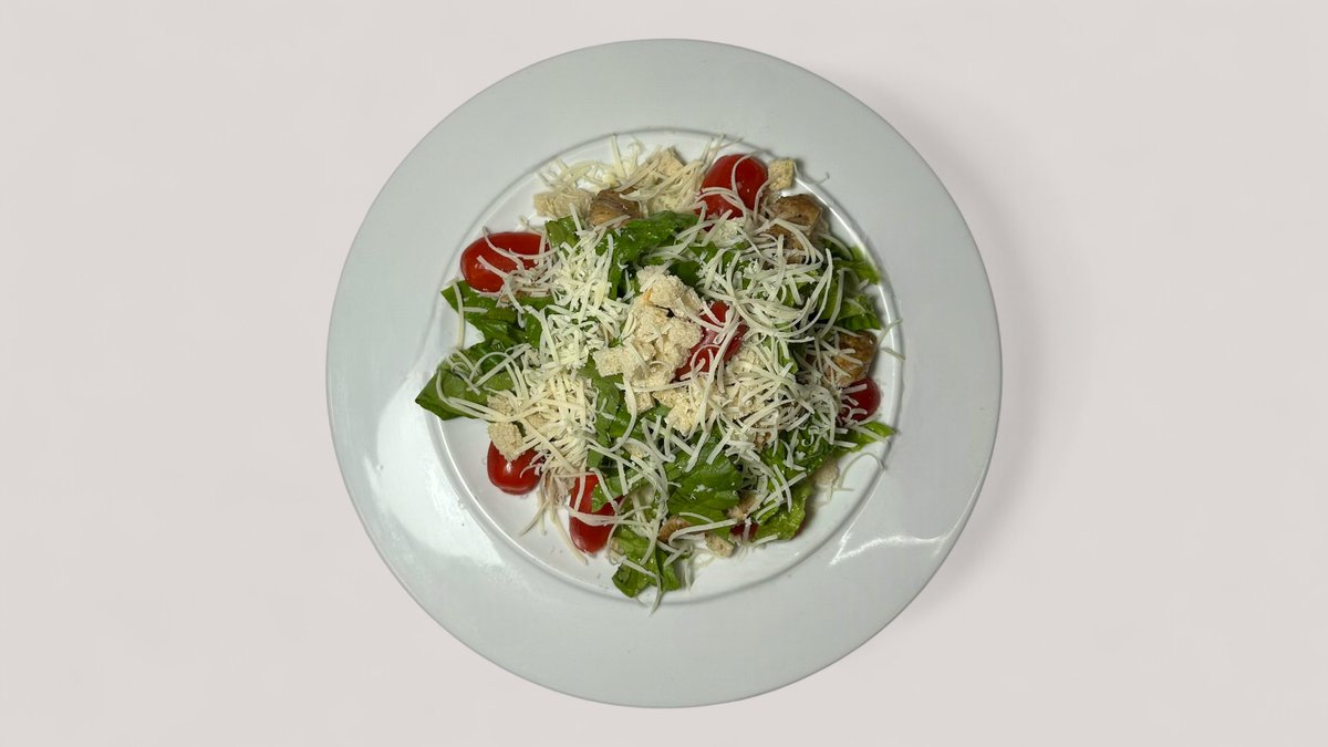 Salotos, pomidorai, skrebučiai, sūris, cezario padažas, vištiena