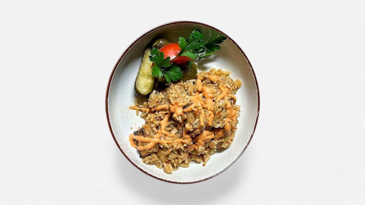Jautiena, ryžiai, pomidorai, kalendra, prieskoniai Patiekiama su bandele