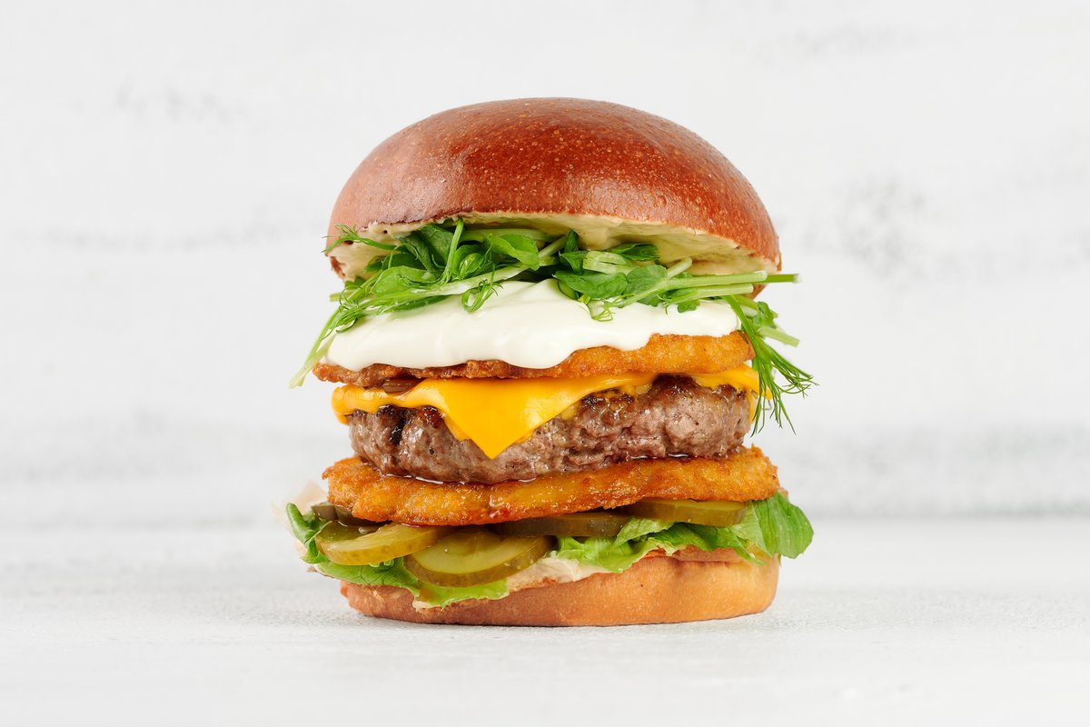 100% Jautienos maltinukas (kepimo lygis medium), čipotlės majonezas, marinuoti agurkėliai, bulviniai blynai, kepta šoninė, karamelizuoti svogūnai, čederio sūris, grietinė, daigai, iceberg salotos