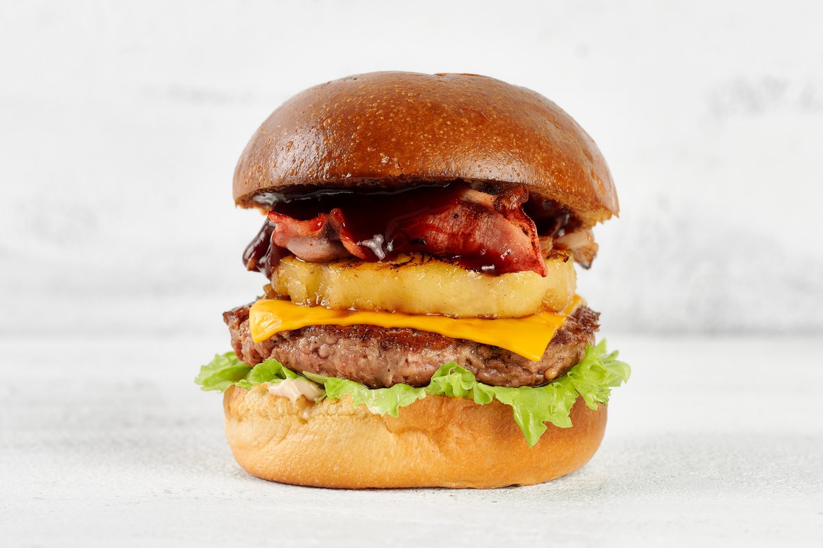 100% Jautienos maltinukas (kepimo lygis medium), čipotlės majonezas, kepta šoninė, ananasas, čederio sūris, BBQ padažas, iceberg salotos