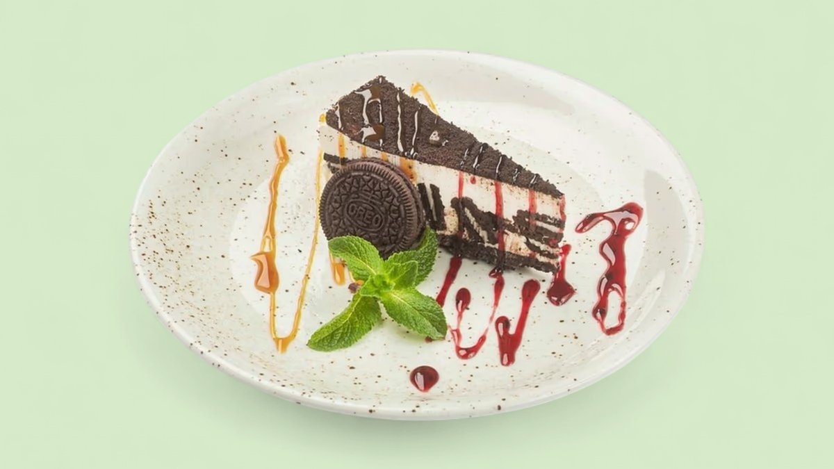 Klasikinis sūrio pyragas su smulkintais Oreo sausainiais, miško uogų ir sūdytos karamelės padažu.
