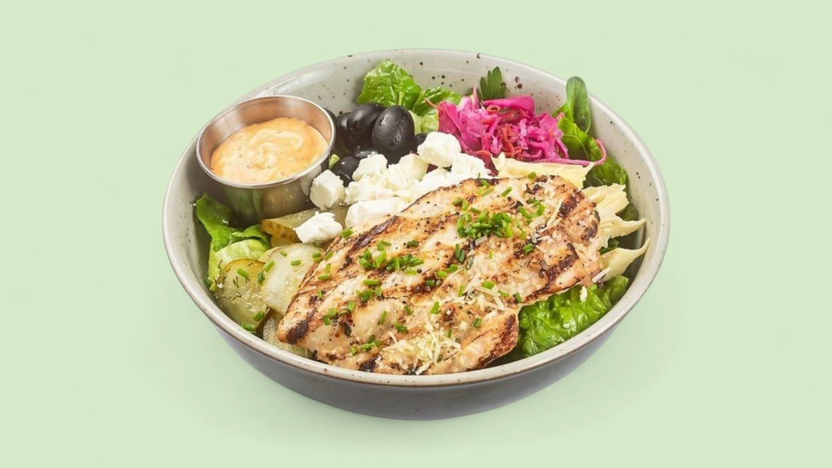 Salotos su vištienos filė, artišokais, fetos sūriu, mišriomis salotomis, aštriomis kopūstų salotomis, marinuotais agurkais, juodosiomis alyvuogėmis ir marinuotais svogūnais. Patiekiama su parmezano ir česnakų padažu.