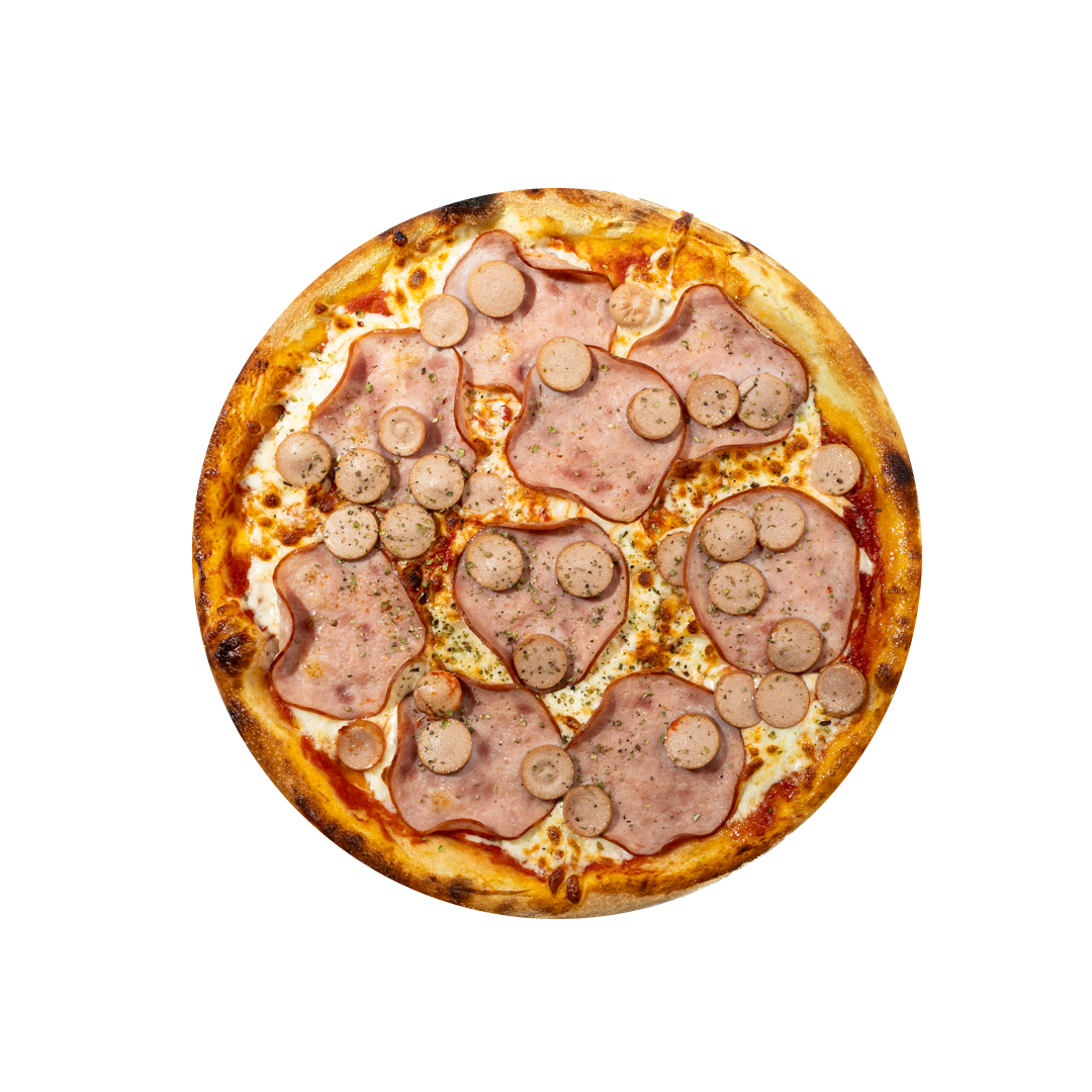Rūkyta šoninė, saliamis, raudonieji svogūnai, marinuoti agurkai, krapai, svogūnų laiškai, pomidorų padažas, mocarela sūris, česnakinis aliejus