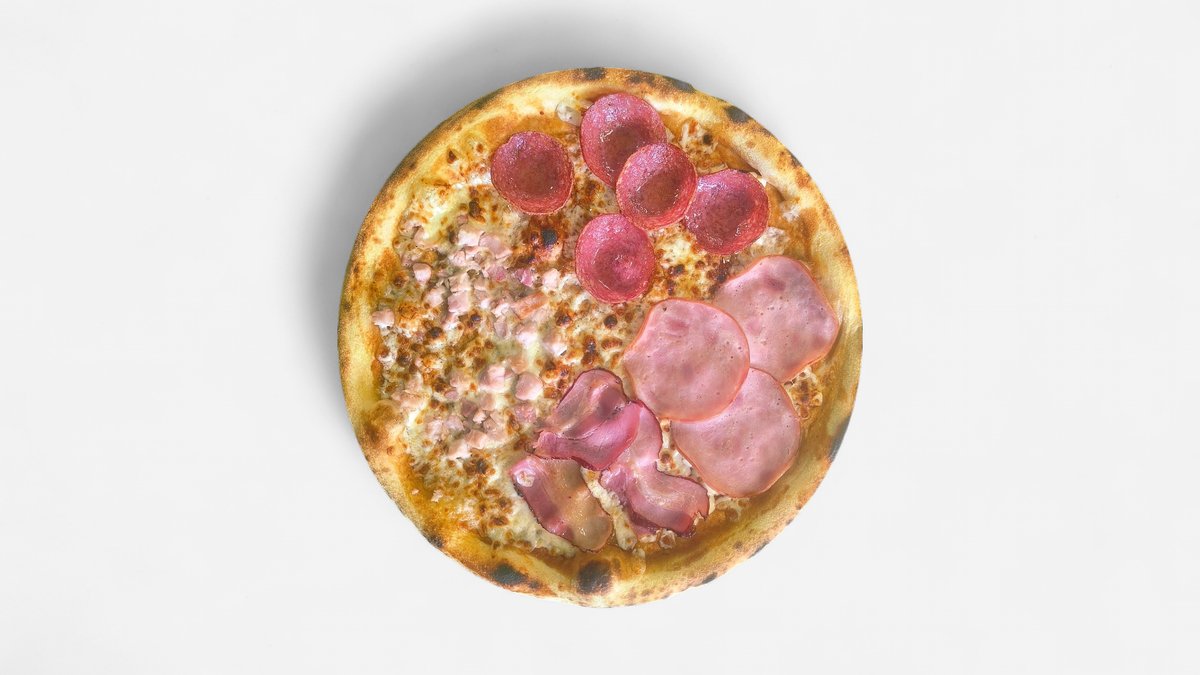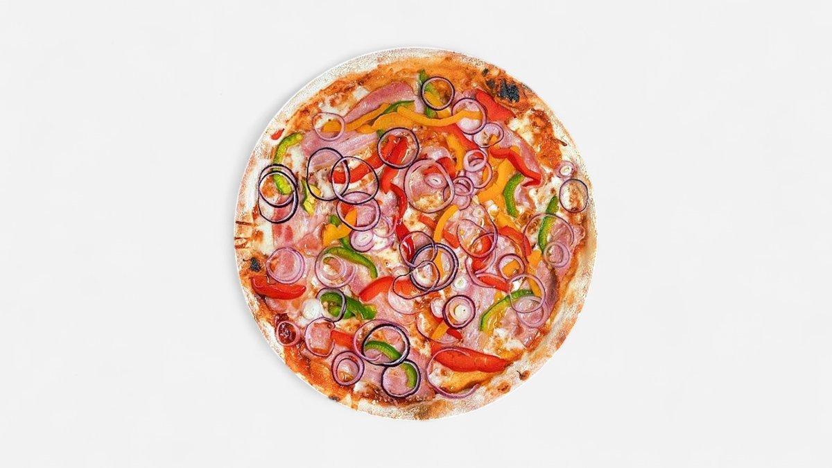 Malta kiauliena, šaltai rūkytas saliamis, įvairiaspalvė paprika, raudonieji svogūnai, BBQ padažas, pomidorų padažas, mocarela sūris, česnakinis aliejus