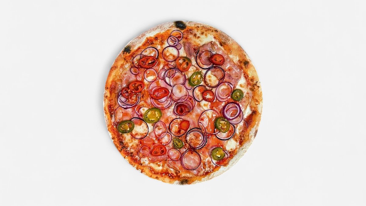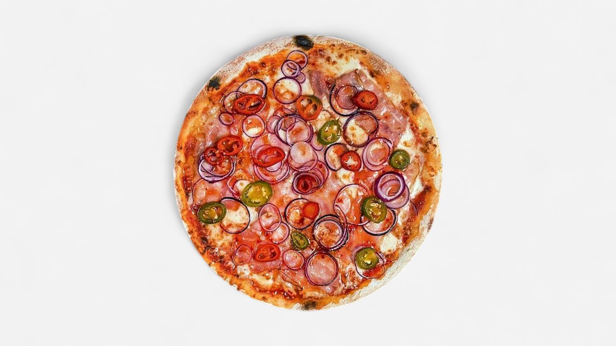 Rūkyta šoninė, agurkai, malta kiauliena, chalapos paprikos 🌶️, sweet chili padažas, pomidorų padažas, mocarela sūris, česnakinis aliejus