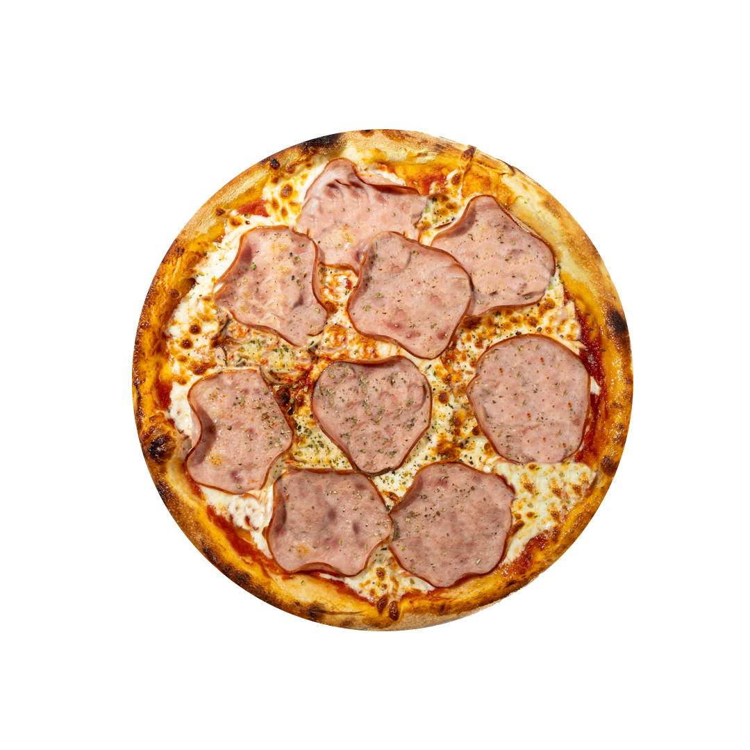 Kumpis, pomidorų padažas, mocarela sūris, česnakinis aliejus