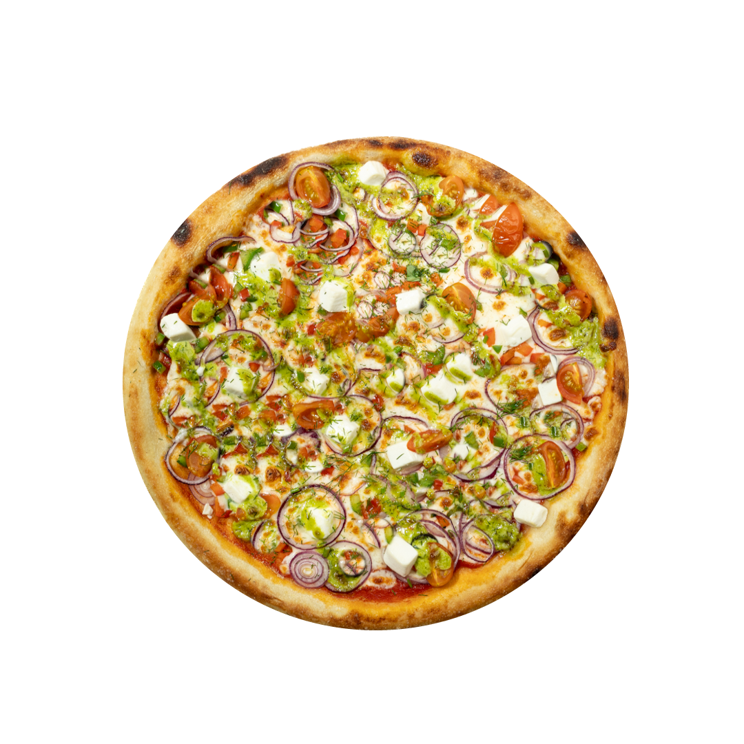 Vyšniniai pomidorai, raudonieji svogūnai, paprika, feta, žaliasis padažas, krapai, picų padažas, mocarela sūris, česnakinis aliejus
