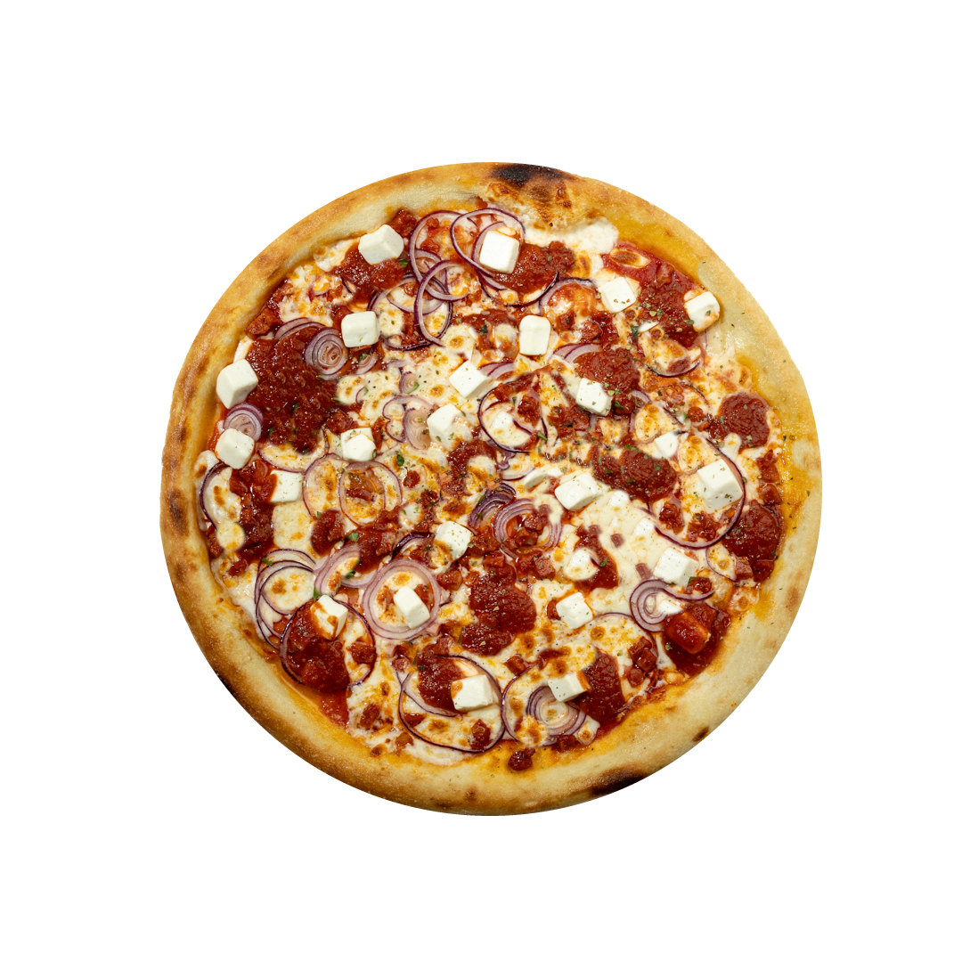 Chorizo dešrelės, salsa padažas,svogūnai, feta, pomidorų padažas, mocarela sūris, česnakinis aliejus