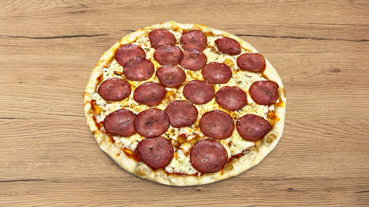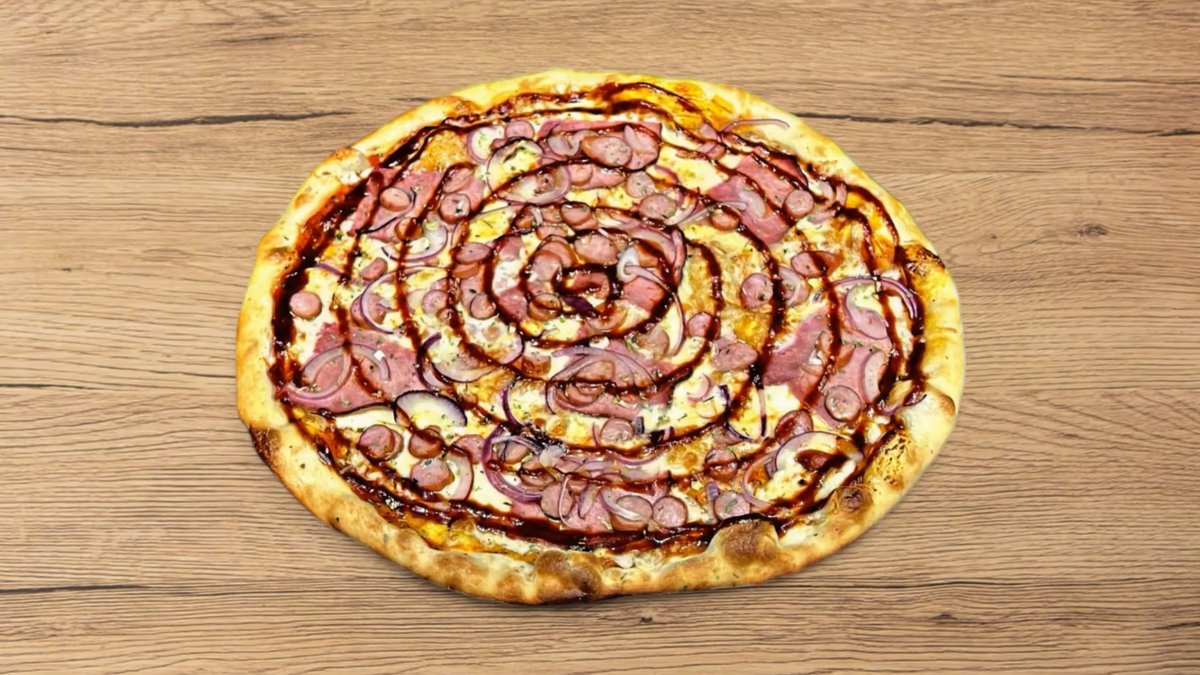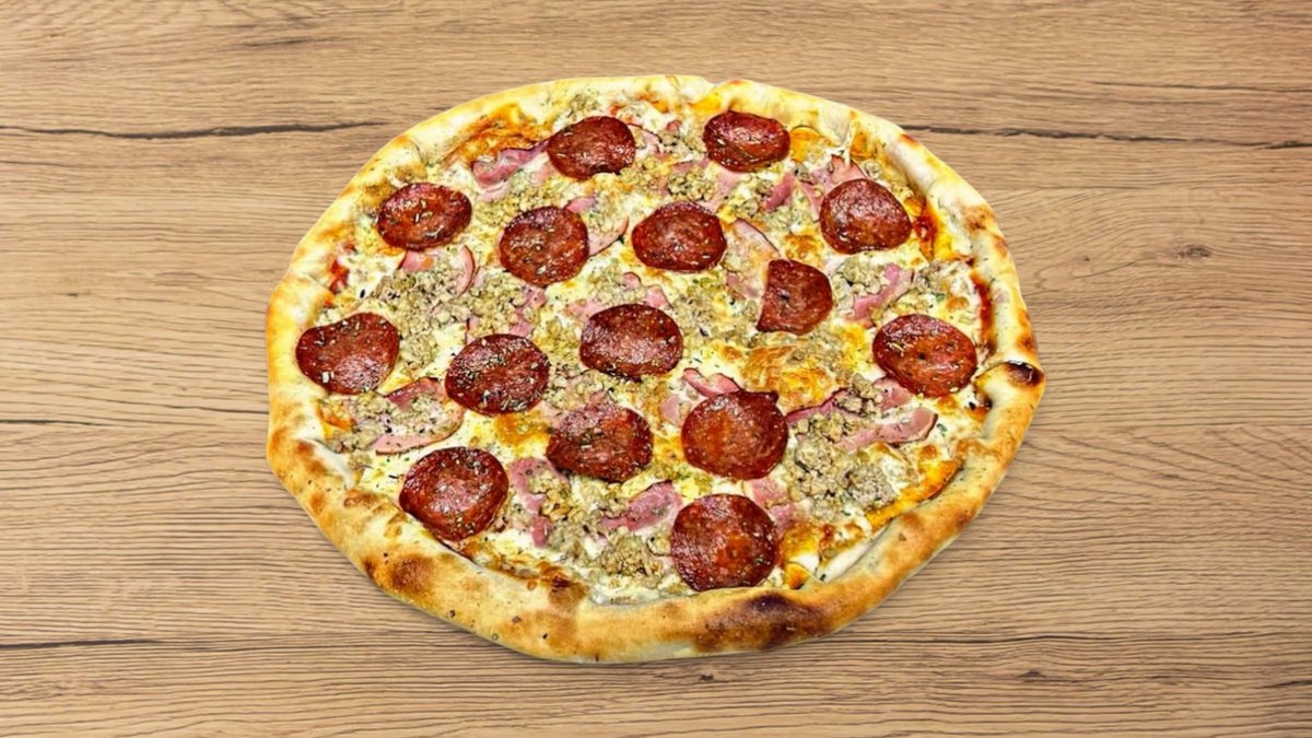 Mėsinga pica su pieniškų dešrelių ir sūrio kraštu 32 cm + pasirinktas gėrimas