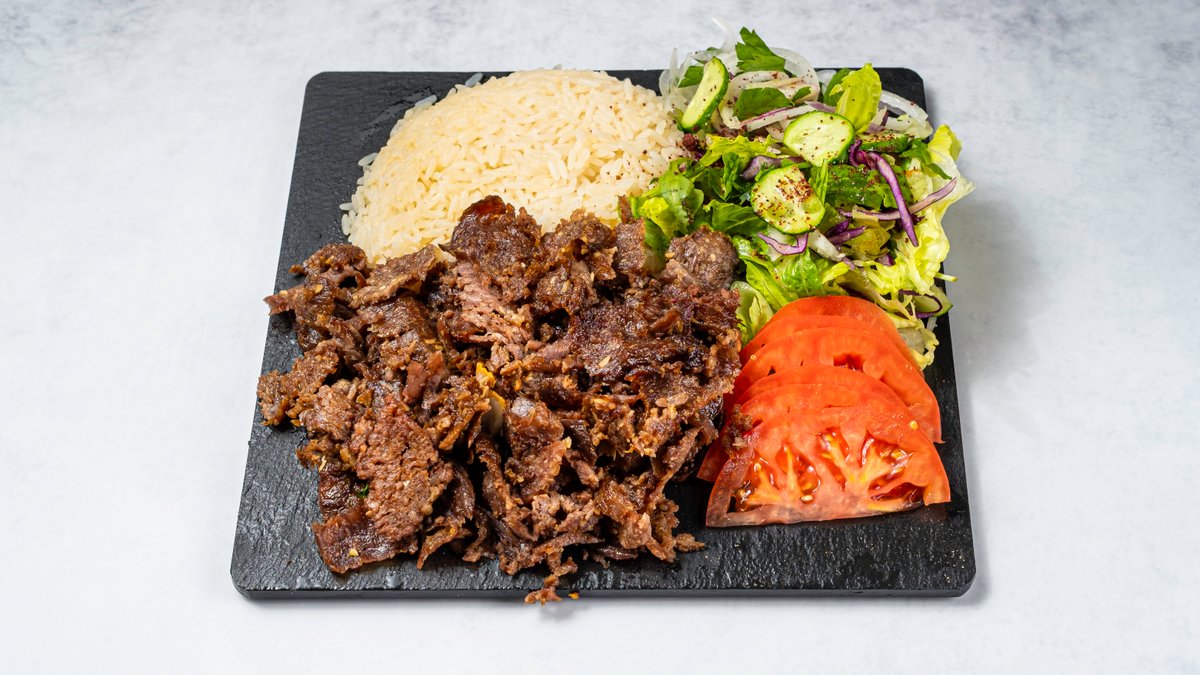 Pekino kopūstai, pomidorai, svogūnai, marinuoti agurkai, šviežias agurkas, alyvuogių aliejus, druska, sumak prieskoniai, kepti ryžiai, rankų darbo kebabas ir padažas pasirinktinai