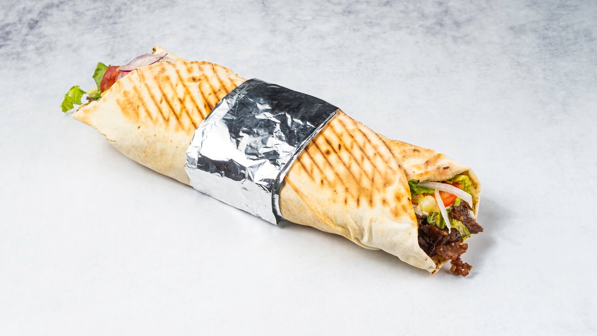 Lavašas, mocarela sūris, pekino kopūstai, svogūnai, marinuoti agurkai, pomidorai, rankų darbo kebabas ir padažas pasirinktinai