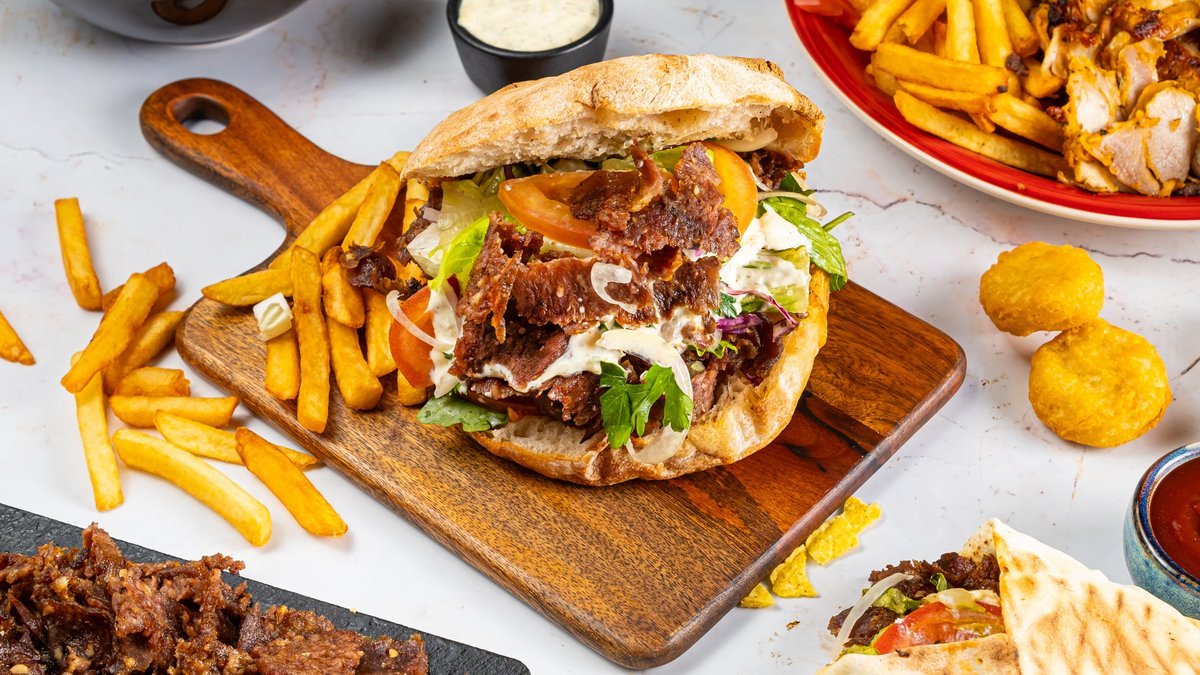 Lavašas, bulvės, čederio sūris, pekino kopūstai, svogūnai, marinuoti agurkai, pomidorai, rankų darbo kebabas ir padažas pasirinktinai