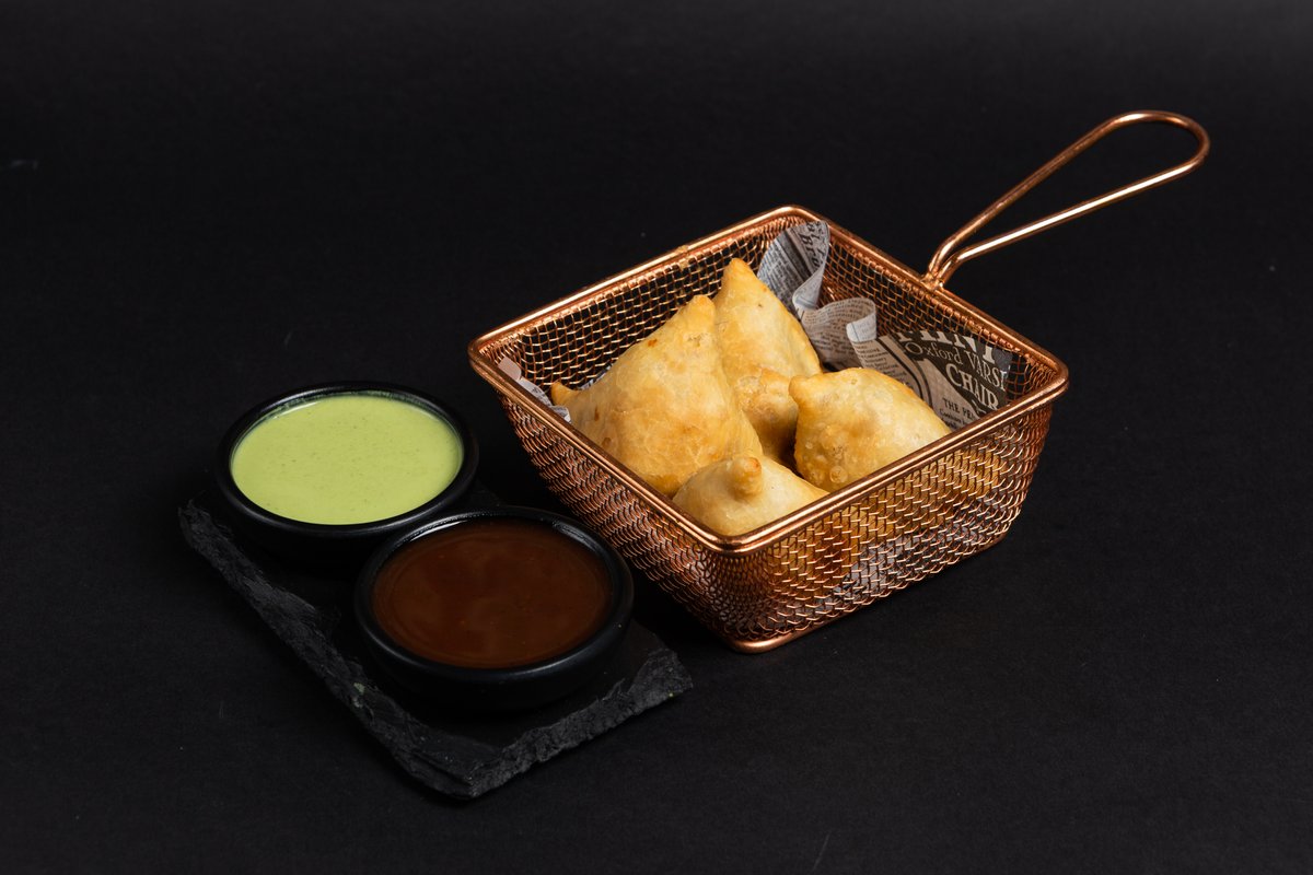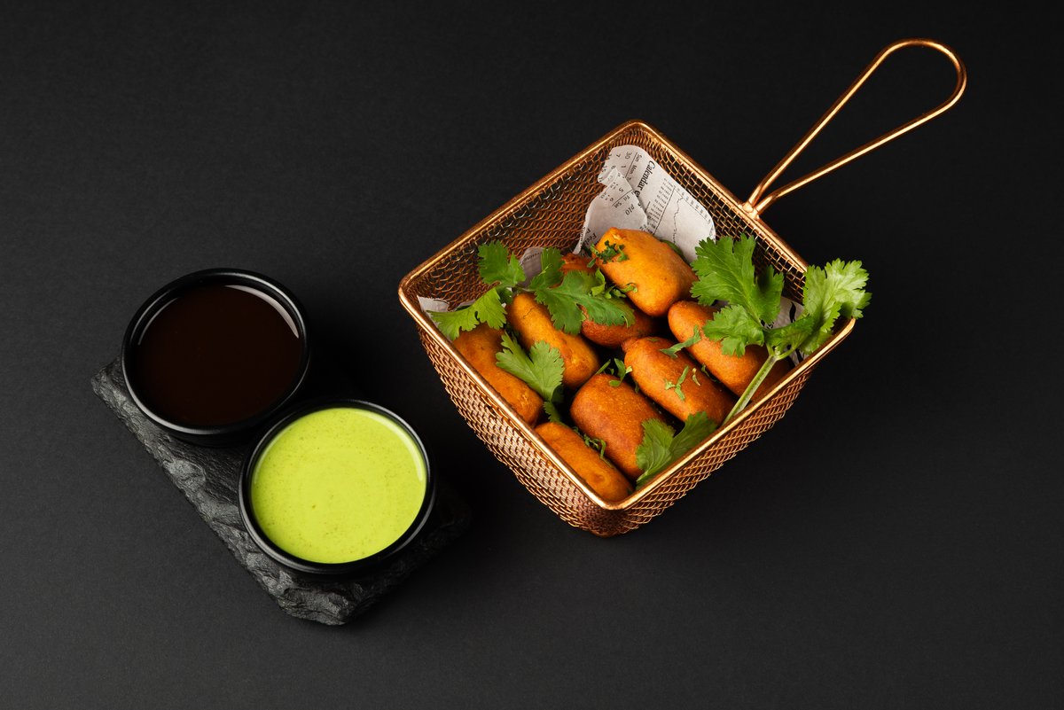 Vienas populiariausių užkandžių Indijos restoranuose. Krevetės marinuotos su indiškais prieskoniais ir masala, patiekiamos su traškiais indiškais paplotėliais