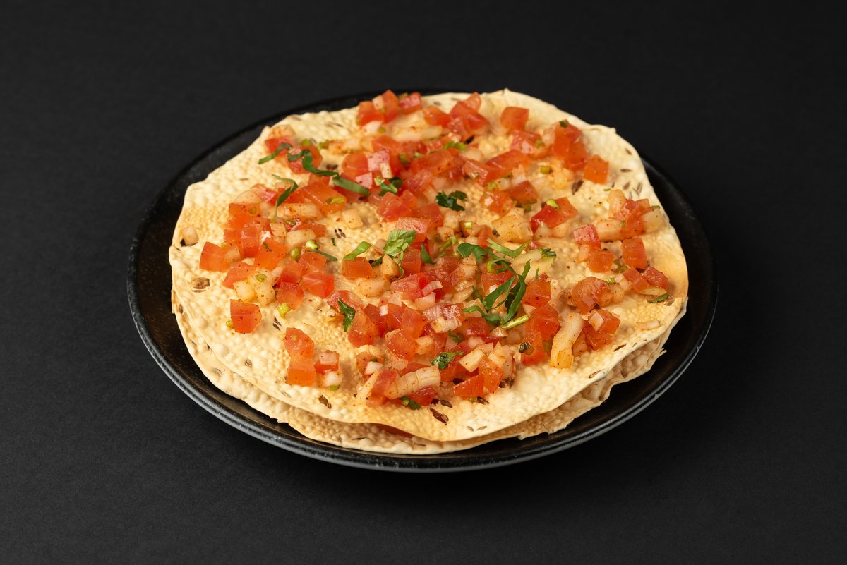 Lęšių miltų paplotėliai patiekiami su smulkintais pomidorais, čili pipirais ir šviežia kalendra