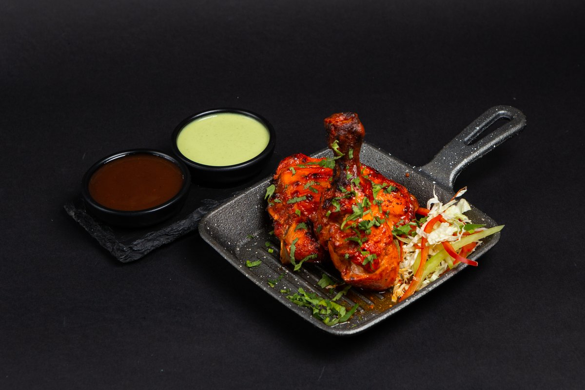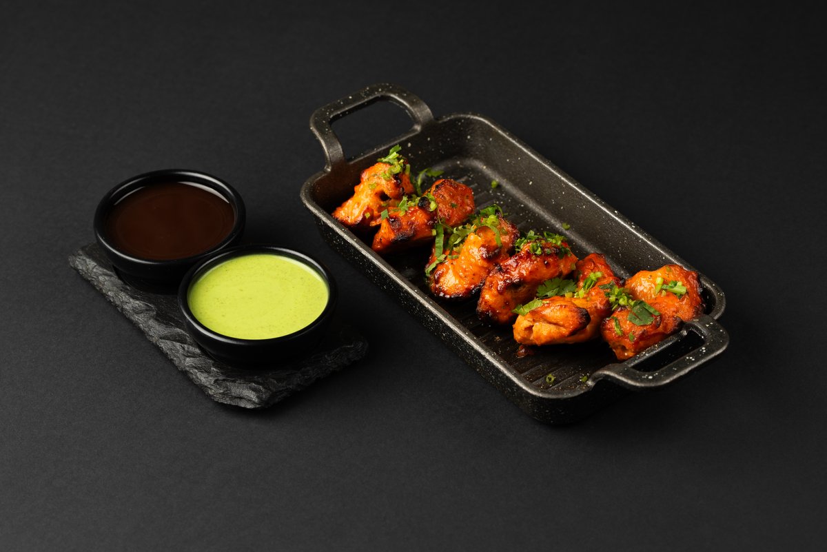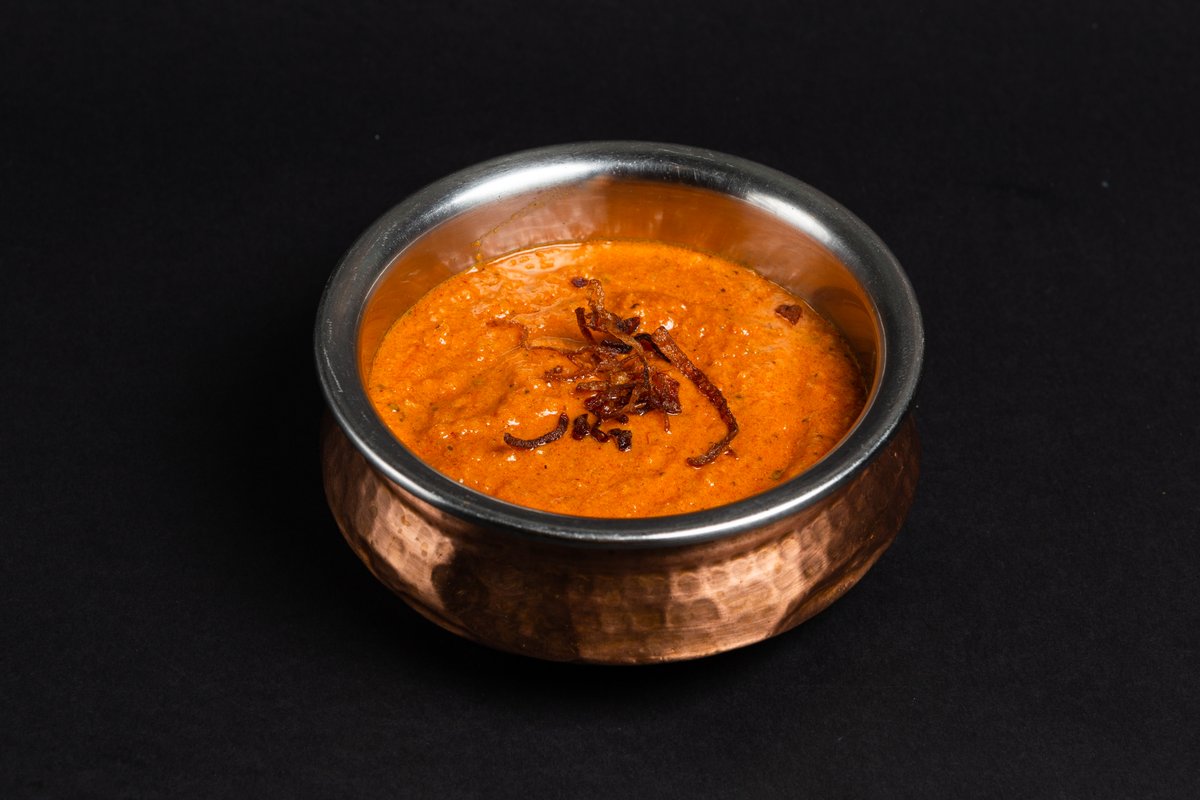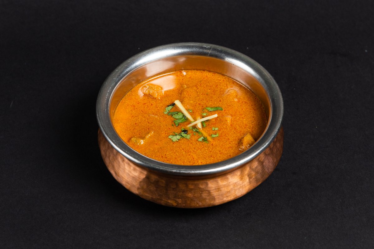 Tandūre skrudinta vištienos šlaunelių mėsa, troškinta su pomidorais, grietinėle ir sviestiniu padažu