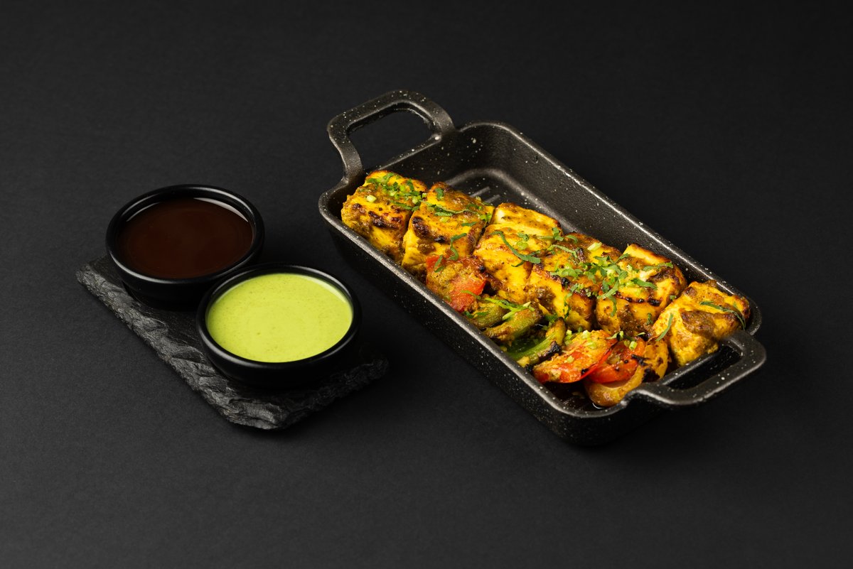 Varškės sūrio gabalėliai, marinuoti indiškuose prieskoniuose ir kepti molinėje krosnyje tandūre
