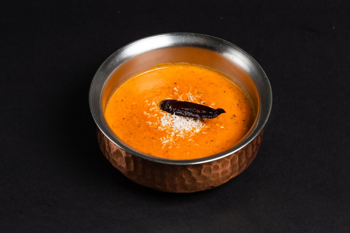 Pietų Indijos patiekalas su kokosu, indiškais prieskoniais ir žaliais aitriaisiais pipirais
