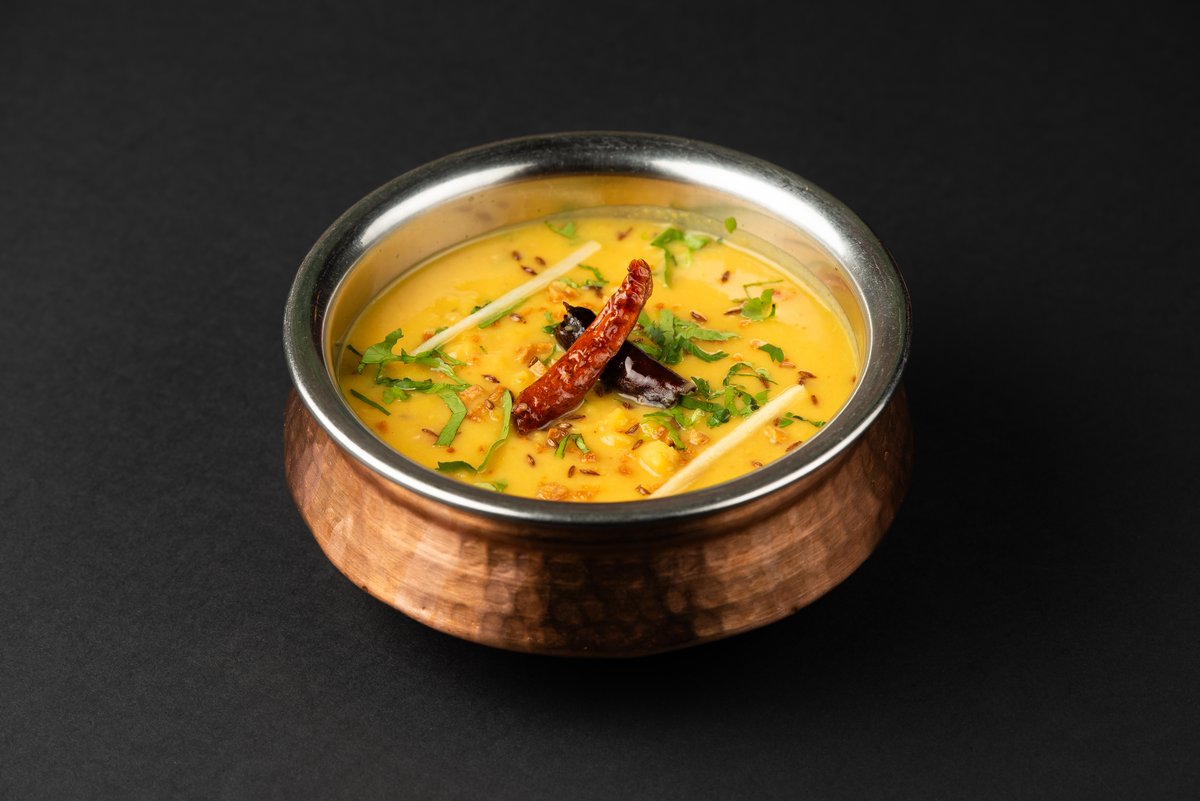 Geltonieji lęšiai virti su pomidorais, imbieru, česnaku, ciberžole, aštriais prieskoniais, raudonaisiais čili pipirais ir pagardinti sviestu