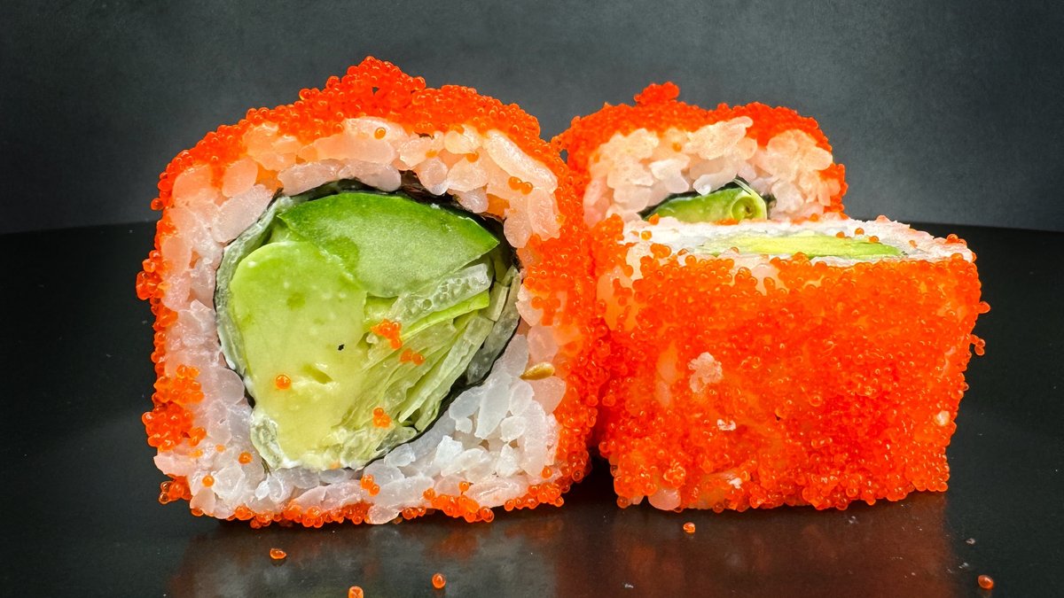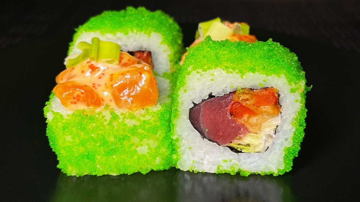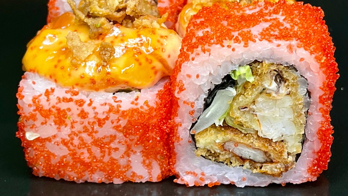 8 vnt. Crispy Tuna, 8 vnt. Sweet exotic, 8 vnt. Tiger Sunrise, 8 vnt. Mango, 8 vnt. California *Ikrų spalva gali skirtis nuo nurodytos nuotraukoje