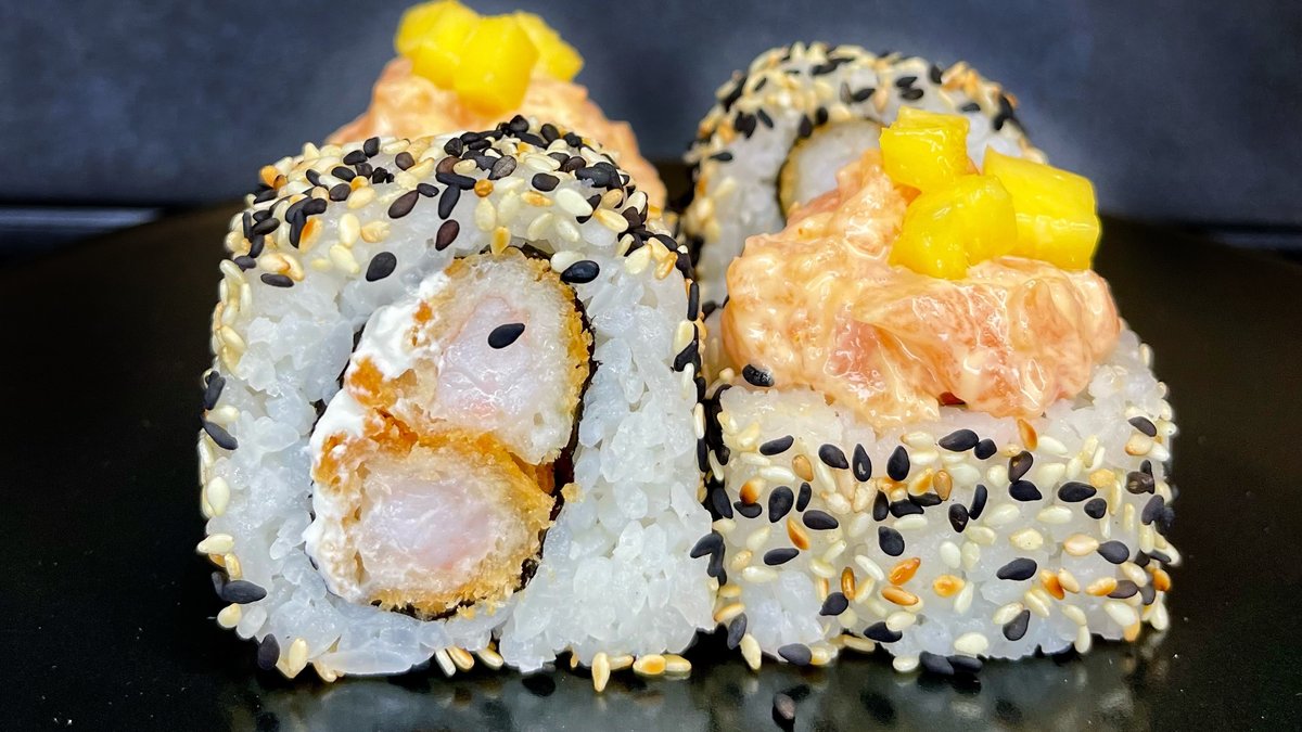 4vnt. keptos krevetės, philadelphia sūris, agurkas, lašiša; 4vnt. keptos krevetės, philadelphia sūris, agurkas, čederio sūris; 4vnt. keptos krevetės, philadelphia sūris, avokadas, ikrai; 4vnt, keptos krevetės, philadelphia sūris, avokadas, sezamai; 4vnt. keptos krevetės *Ikrų spalva gali skirtis nuo nurodytos nuotraukoje