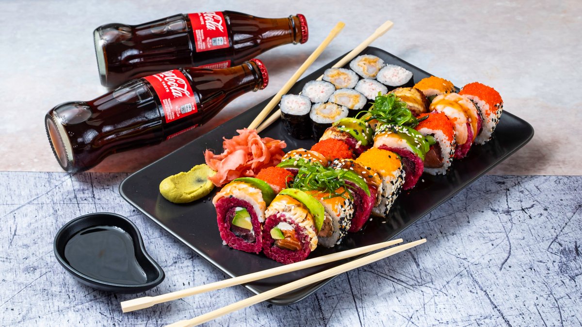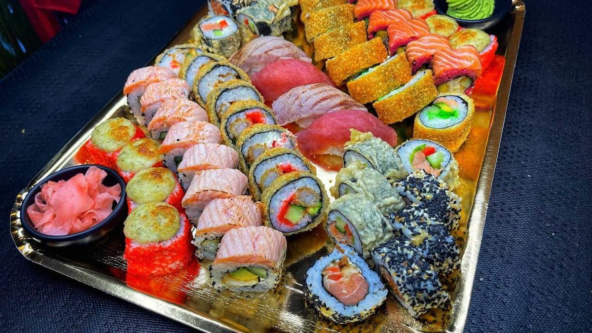 8 vnt. Escobar, 8 vnt. Jelapeno Maki, 8 vnt. Salmon Maki, 8 vnt. California, 8 vnt, Sunrise, 8 vnt. Tokyo *Ikrų spalva gali skirtis nuo nurodytos nuotraukoje