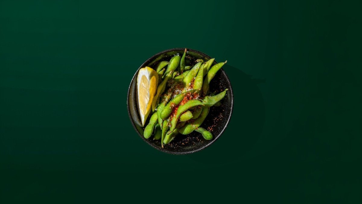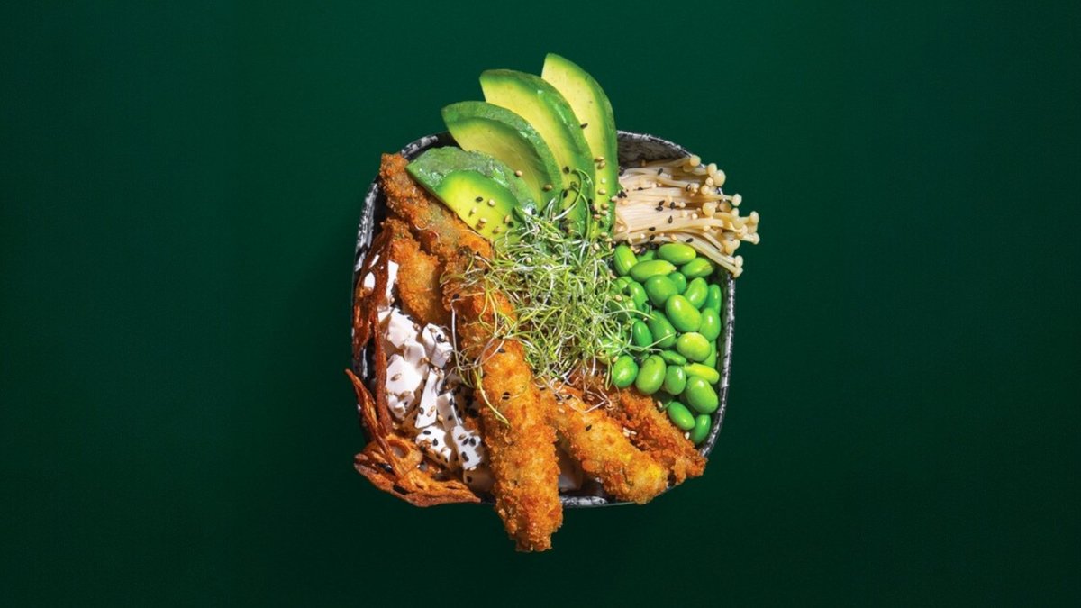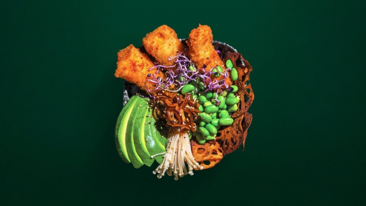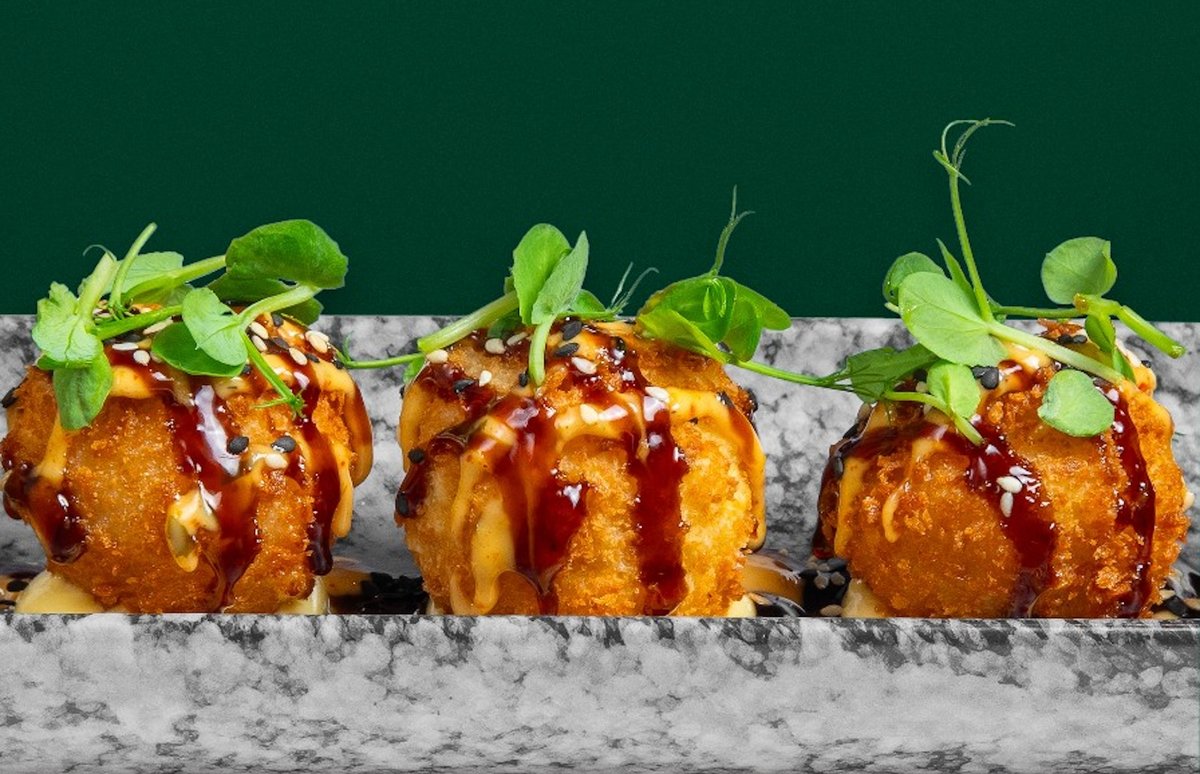 Sušių ryžiai su goma padažu, lašiša kepta tempuroje, sojų pupelės spjoje marinuoti svogūnai, marinuoti enoki grybai, avokadas, lotoso šaknų traškučiai, ridikėlių daigai, teriyaki mayo padažas.