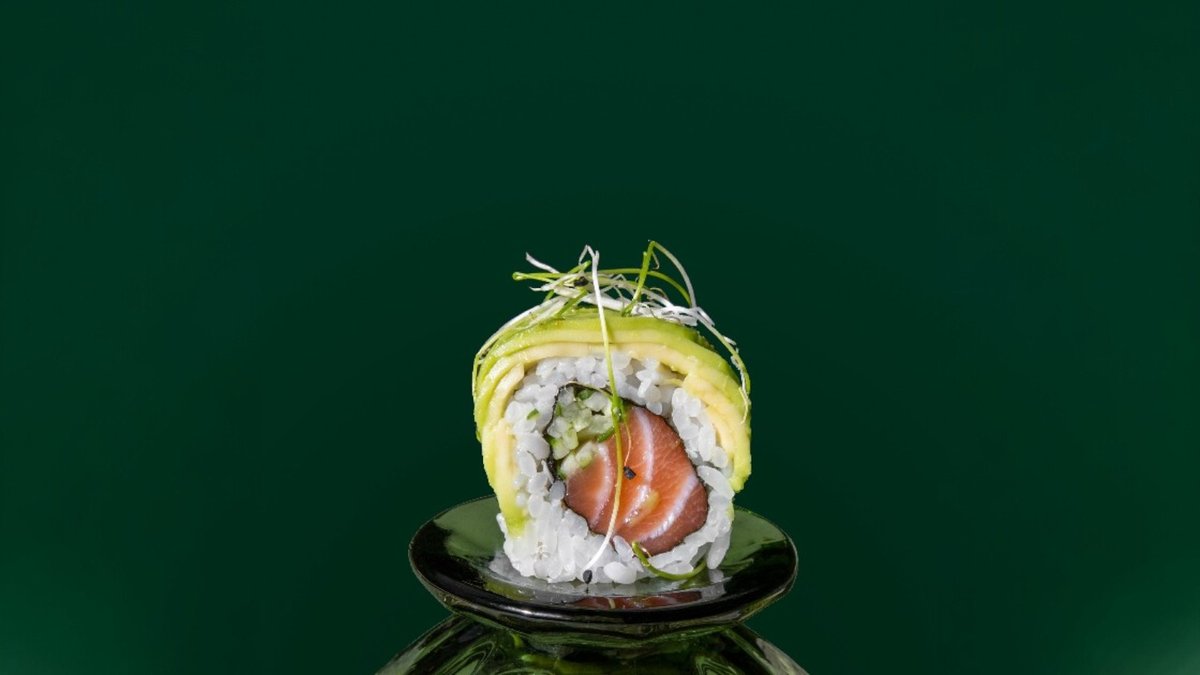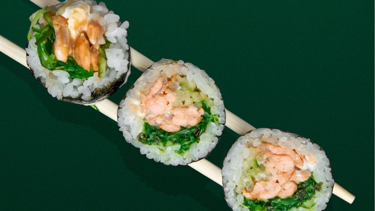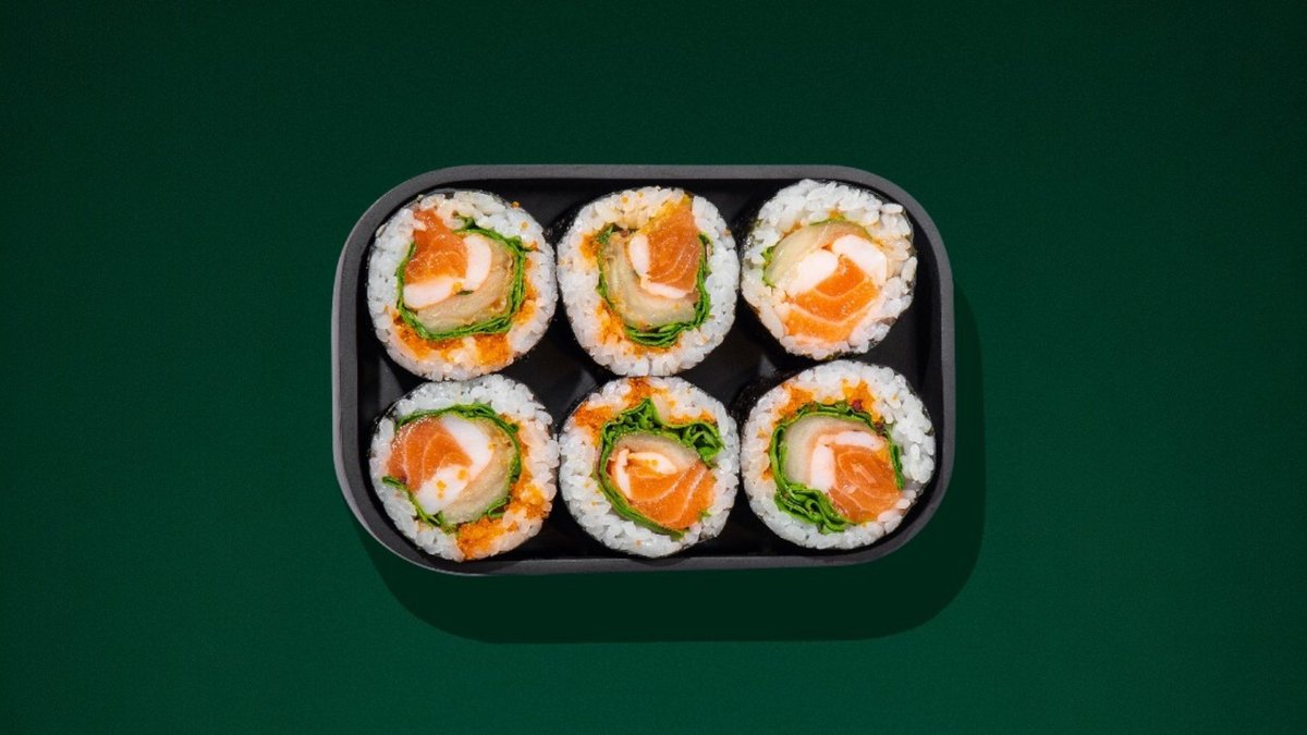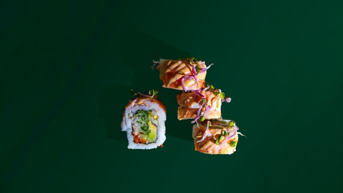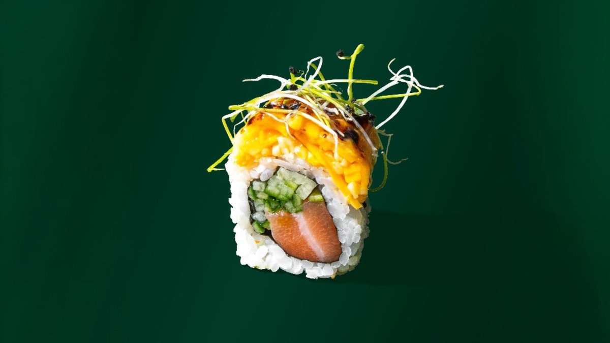 Lašiša, filadelfijos sūris, sushių ryžiai, teryaki ir aštrus padažas, japoniškas majonezas, sezamų sėklos, žirnelių daigai.