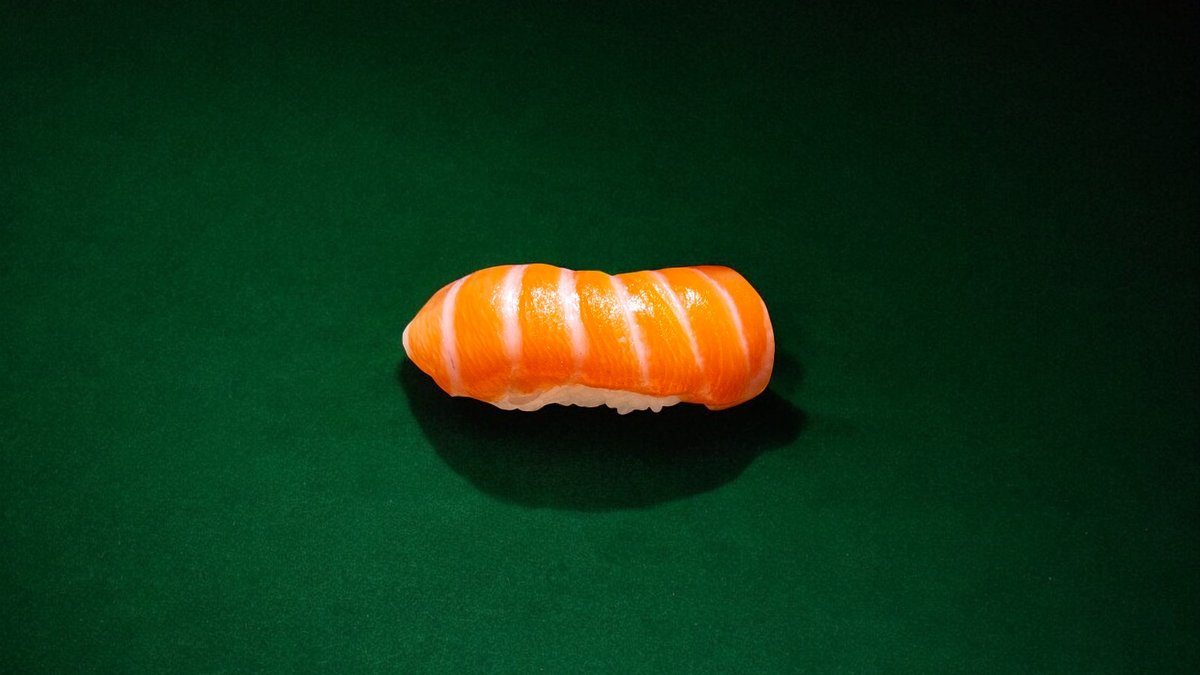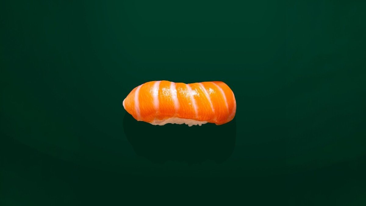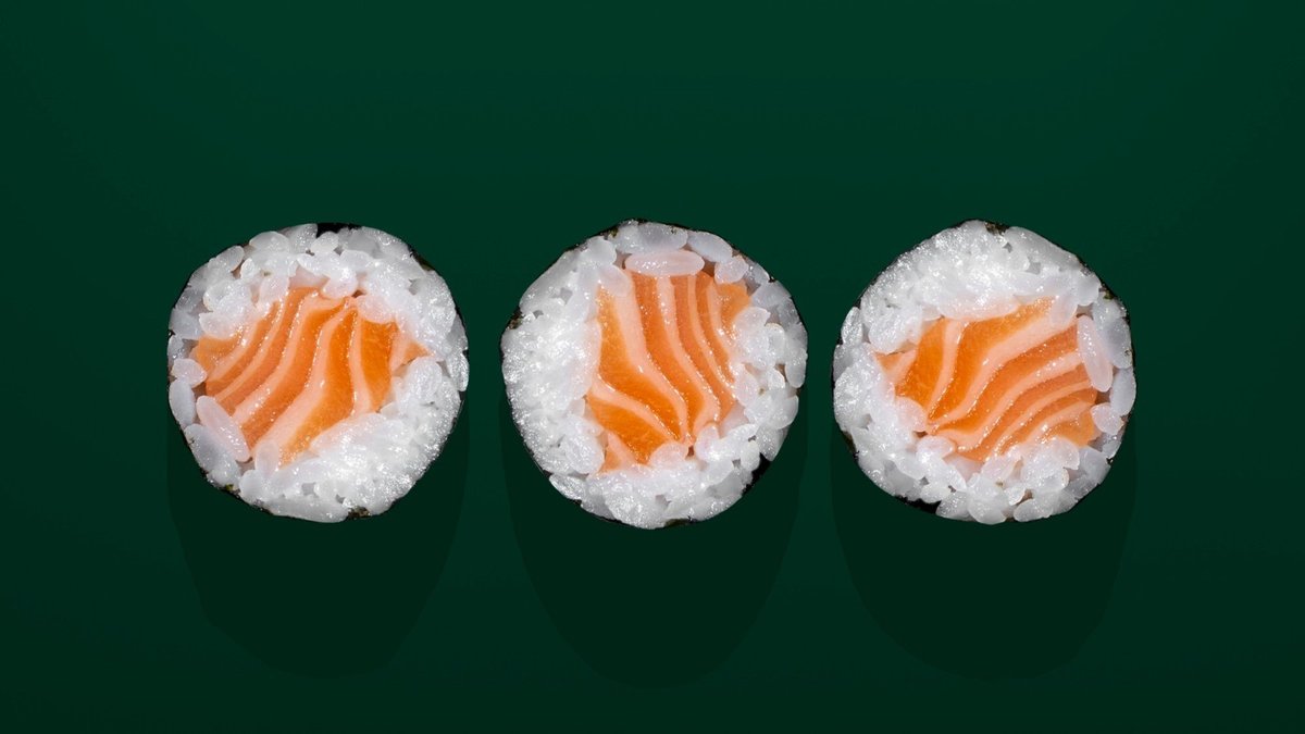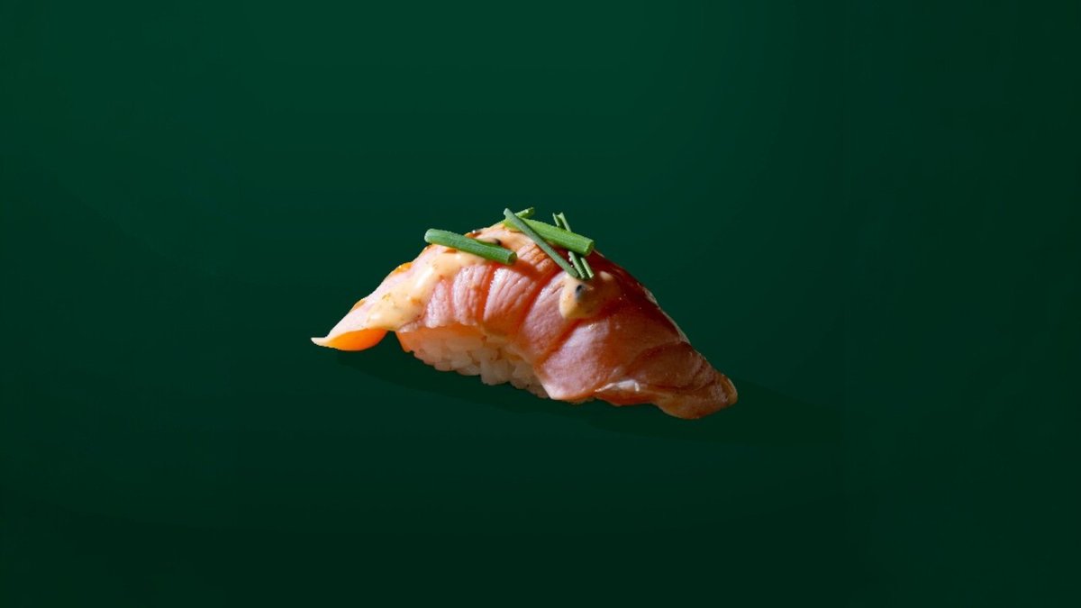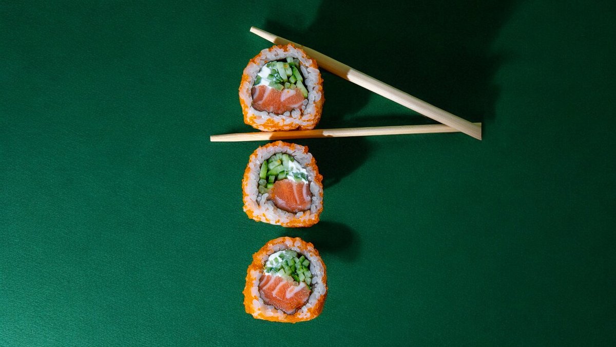 Lašiša, filadelfijos sūris, sushių ryžiai, teryaki ir aštrus padažas, japoniškas majonezas, sezamų sėklos, žirnelių daigai.