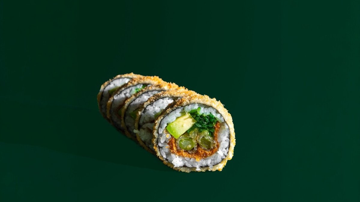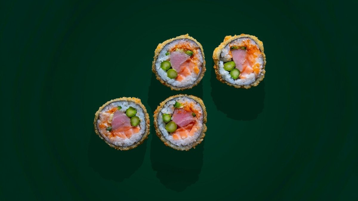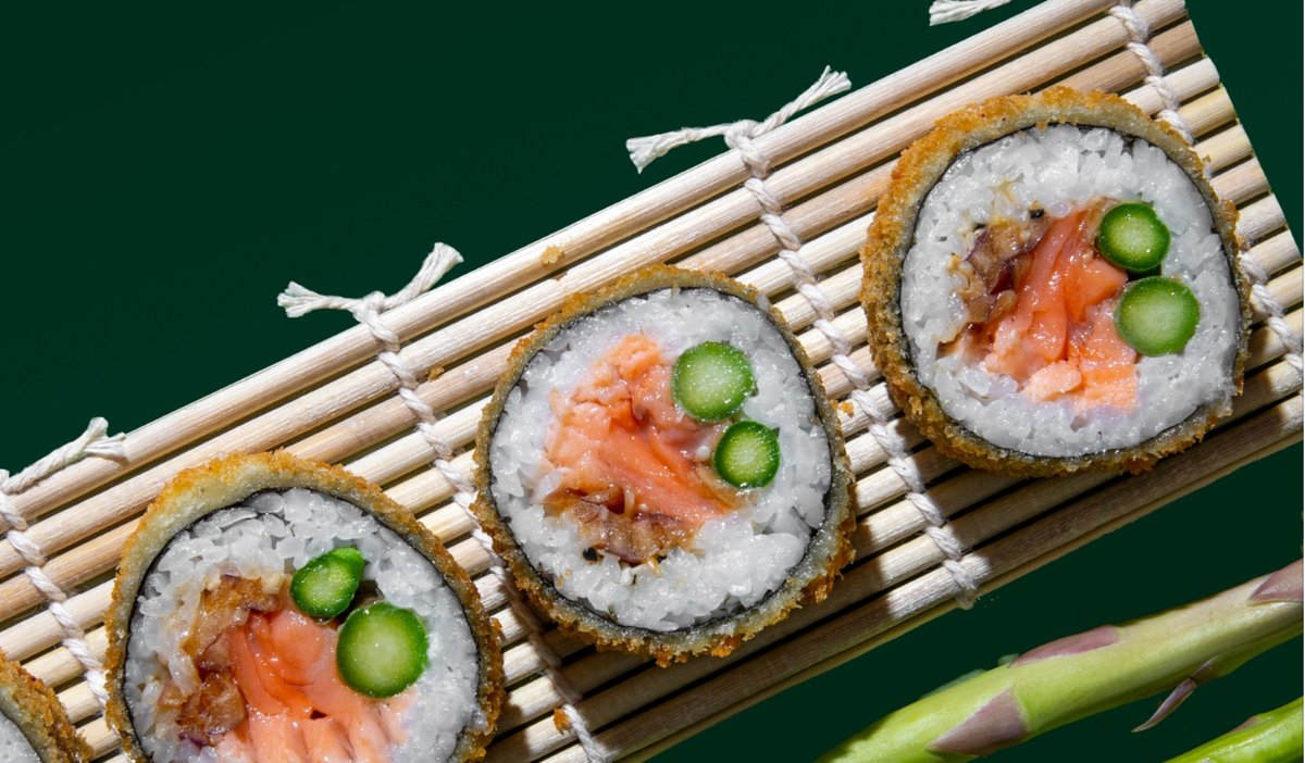 Tempuroje kepti šparagai, inari, avokadas, jūros dumbliai