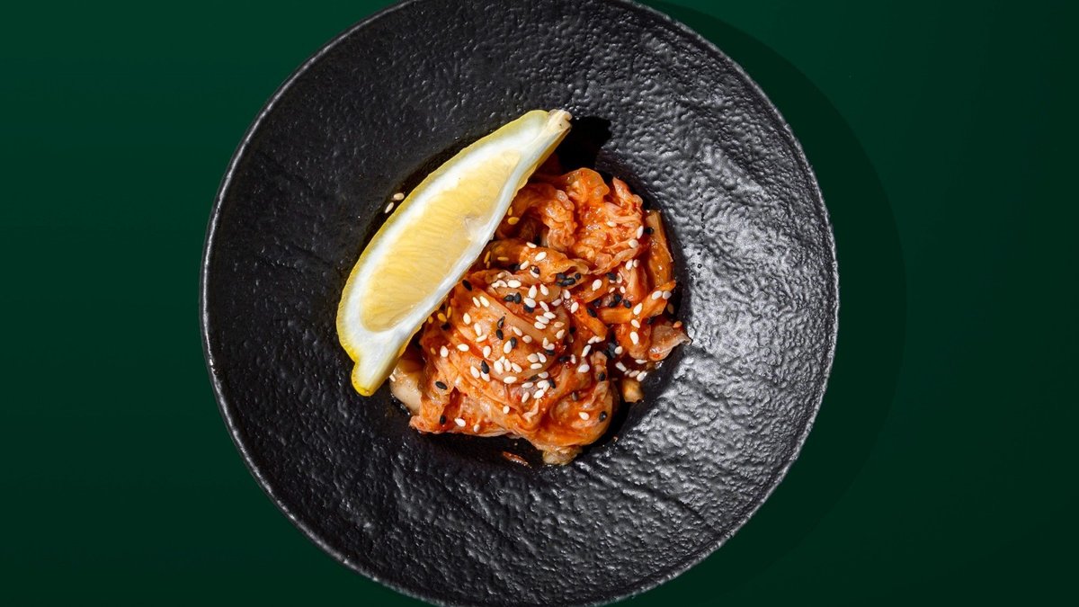 Sušių ryžiai su sezamų padažu, tunas su kimchi padažu, sojų pupelės, baltas ridikas, kimchi salotos, avokadas, ridikėlių daigai.