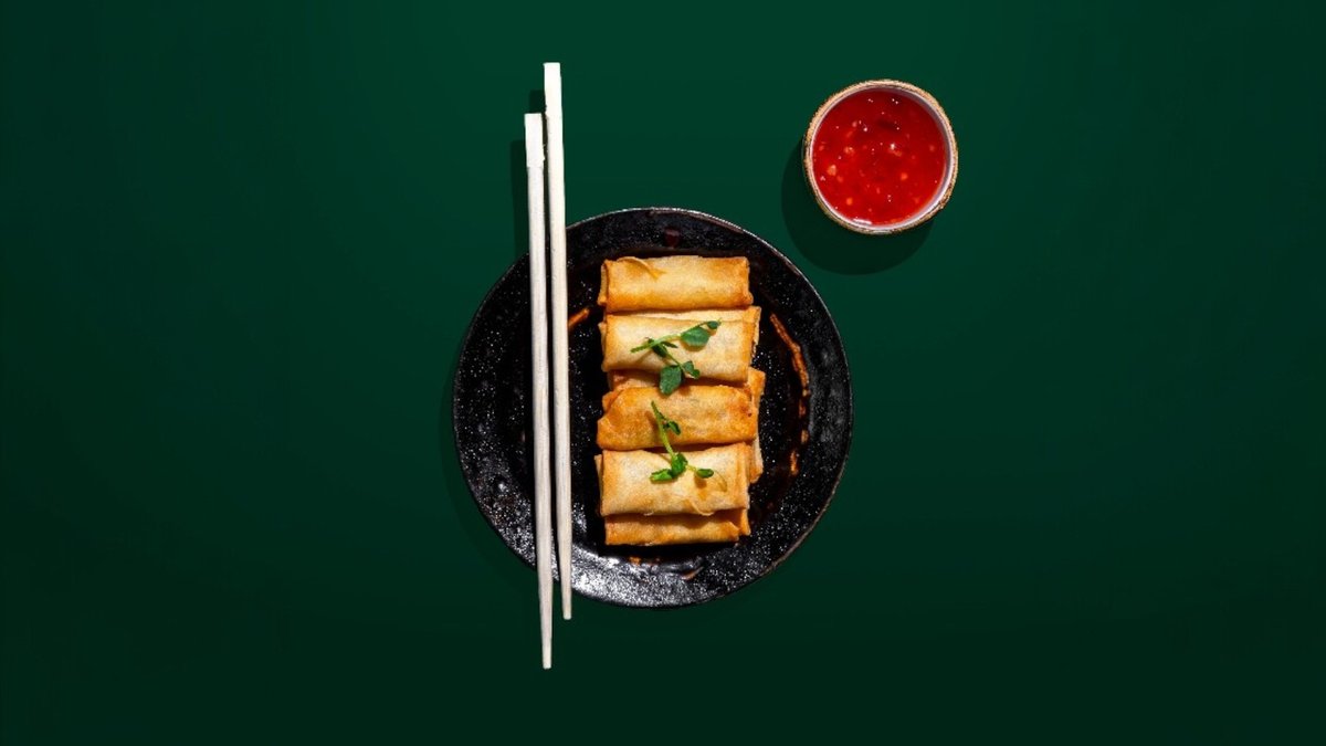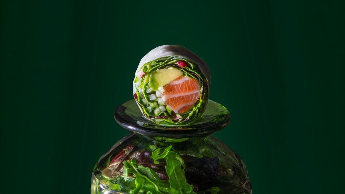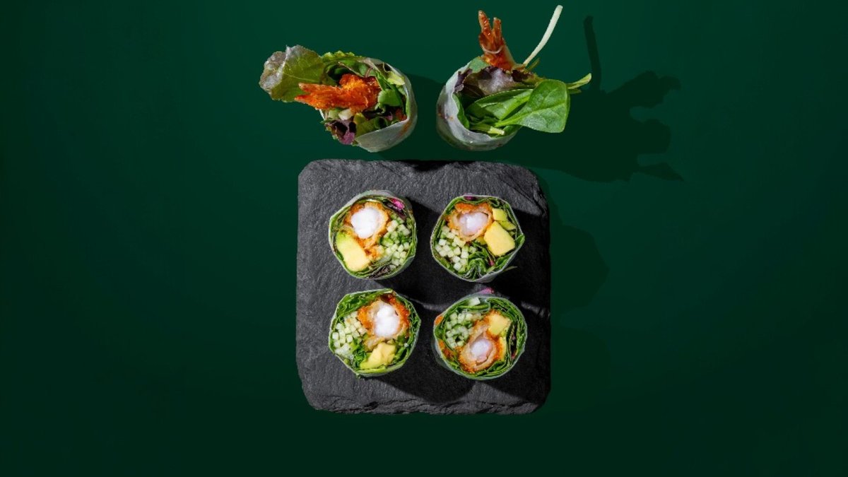 Ryžių lakštas, lašiša, salotų mišinys, agurkas, avokadas. Pateikiamas su goma padažu.