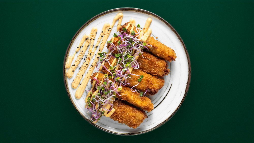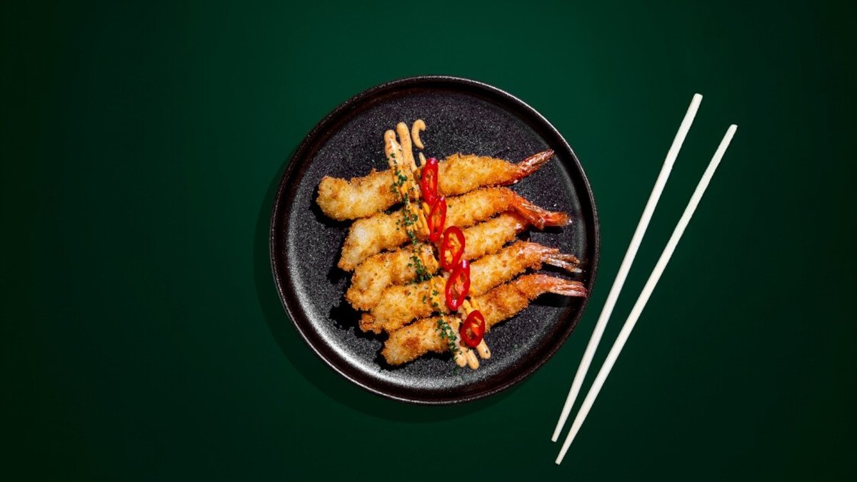 Keptos tigrinės krevetės tempuroje (5vnt.) Pateikiamos su aštriu mayo, laiškiniais česnakais ir čili pipirais