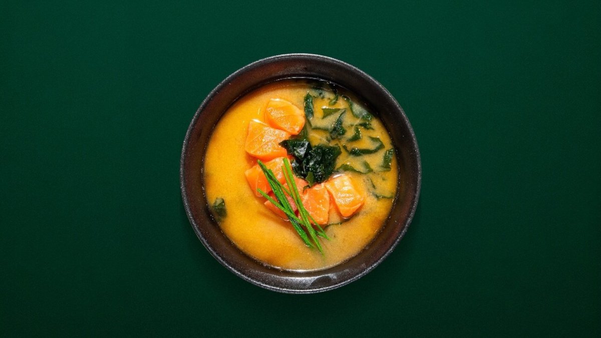 Miso sultinys, jūros dumbliai, laiškiniai česnakai ir lašiša arba tofu