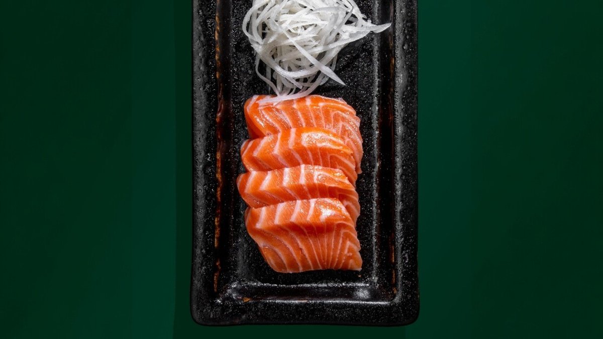 Lašiša, aštrus padažas, masago ikrai, laiškinis česnakas, agurkas