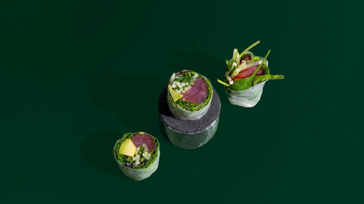 Ryžių lakštas, tunas, salotų mišinys, agurkas, avokadas. Pateikiamas su goma padažu.