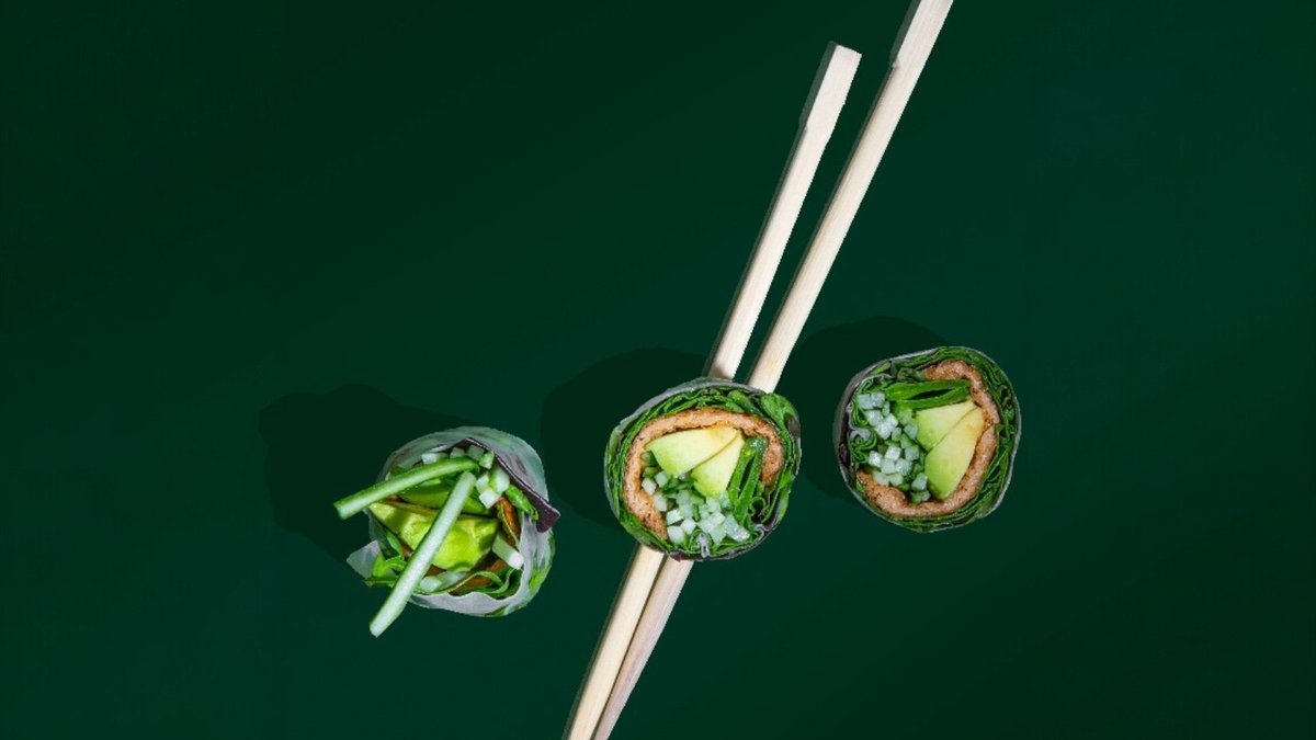 Ryžių lakštas, inari, salotų mišinys, agurkas, avokadas, cukriniai žirneliai. Pateikiamas su goma padažu.